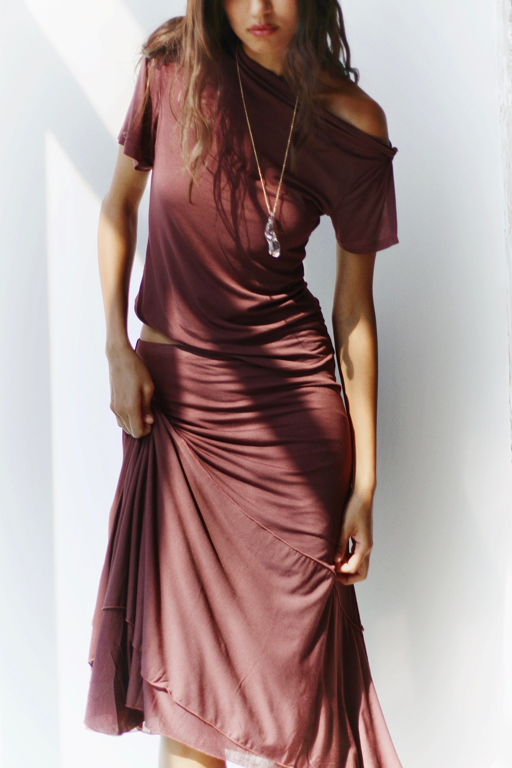 Asymmetric top in a light burgundy modal and cashmere fabric. Made in Italy.