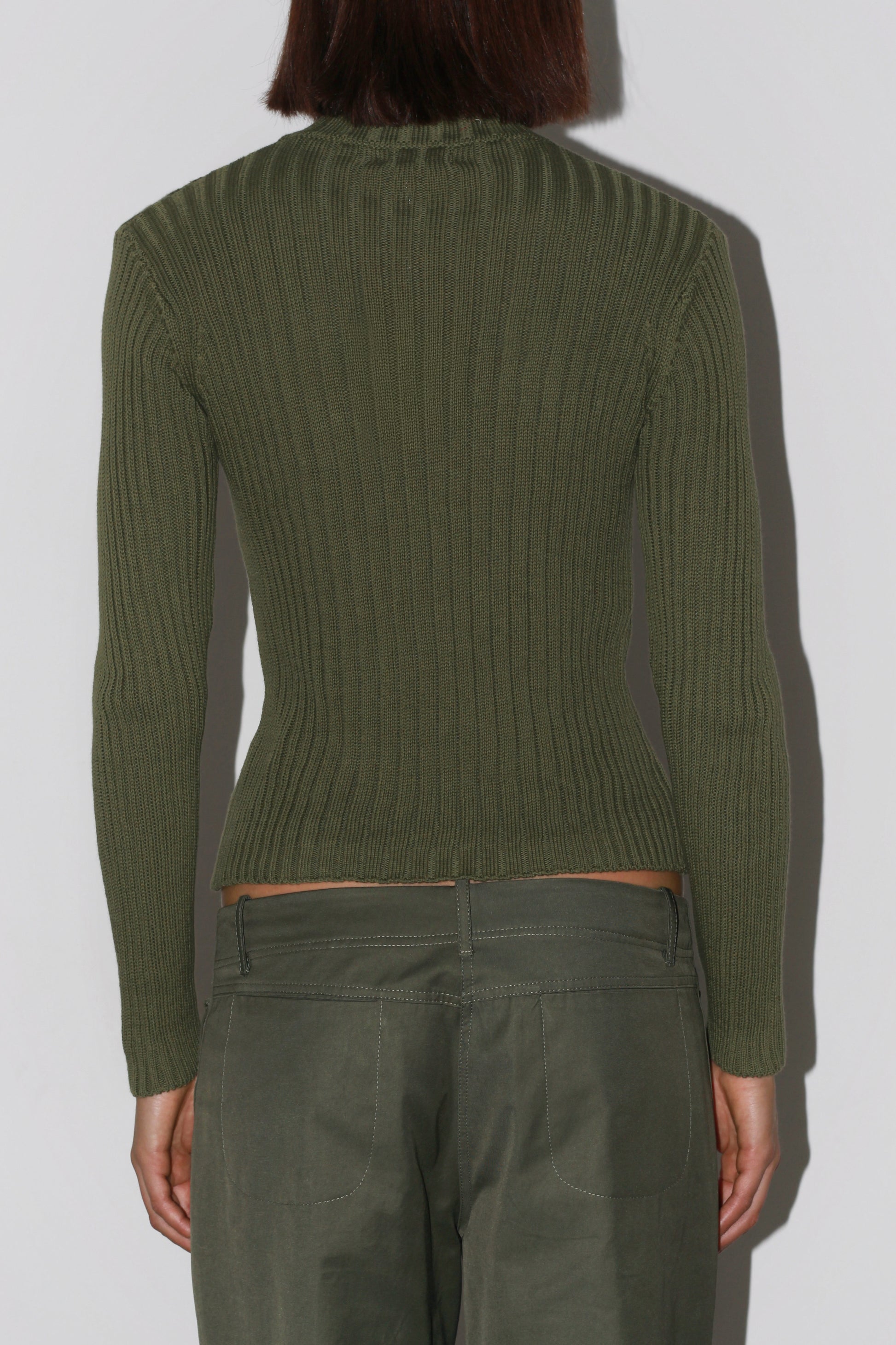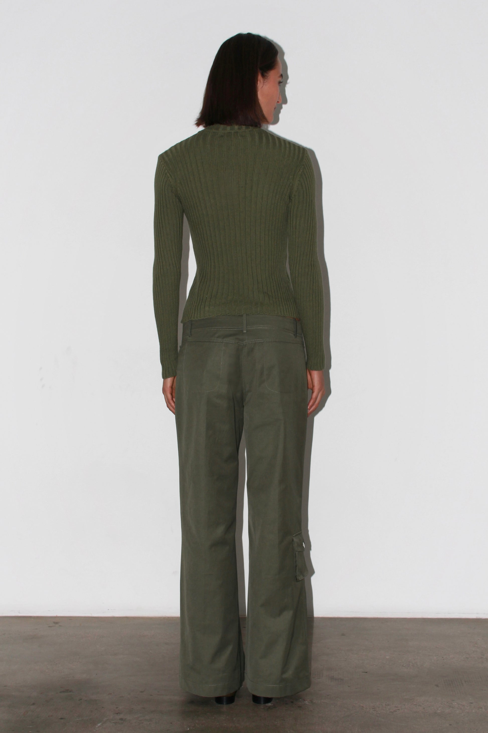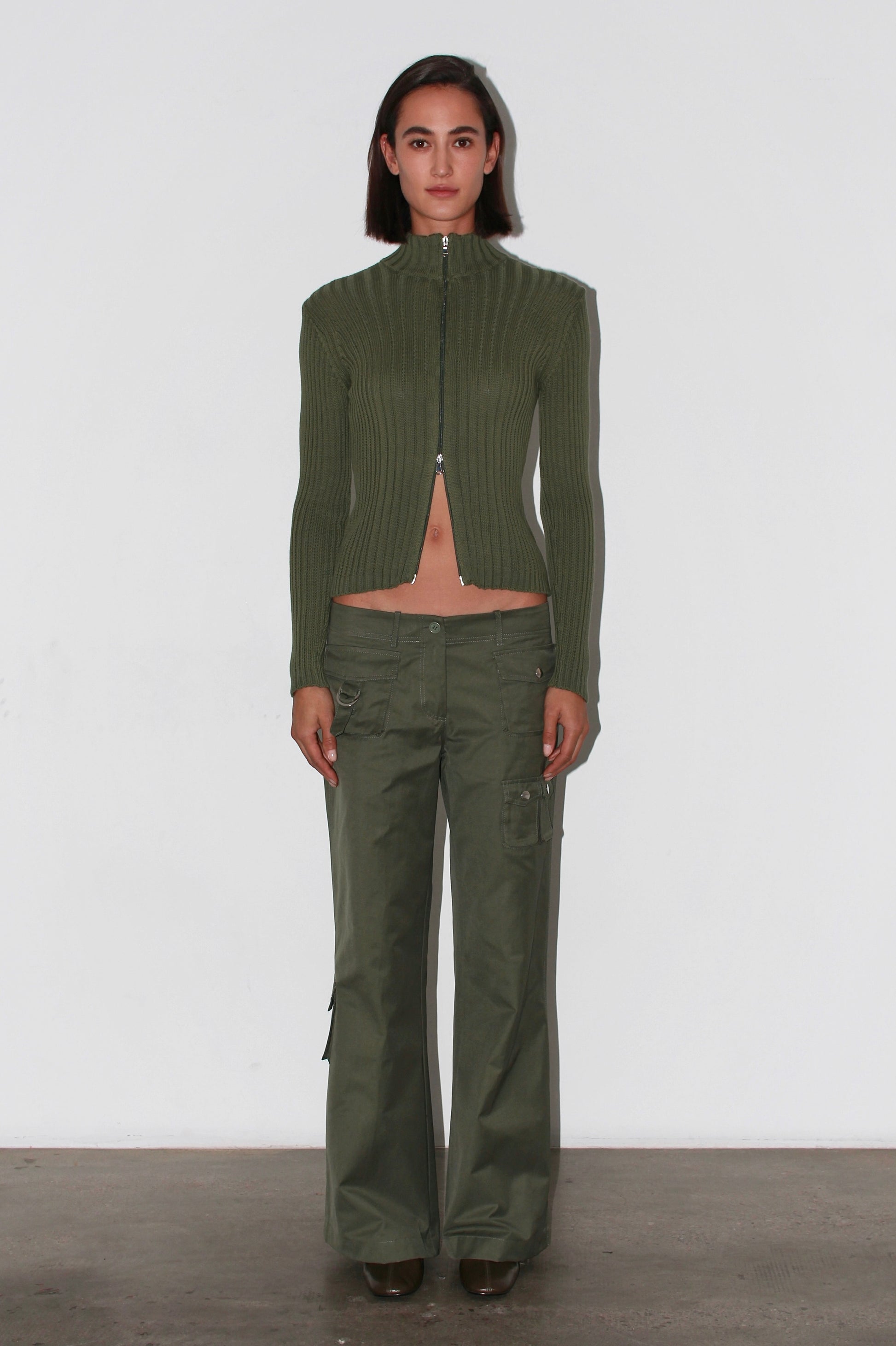 Fitted green ribbed knit top with high neckline and two-way zipper detail. Made in Italy.