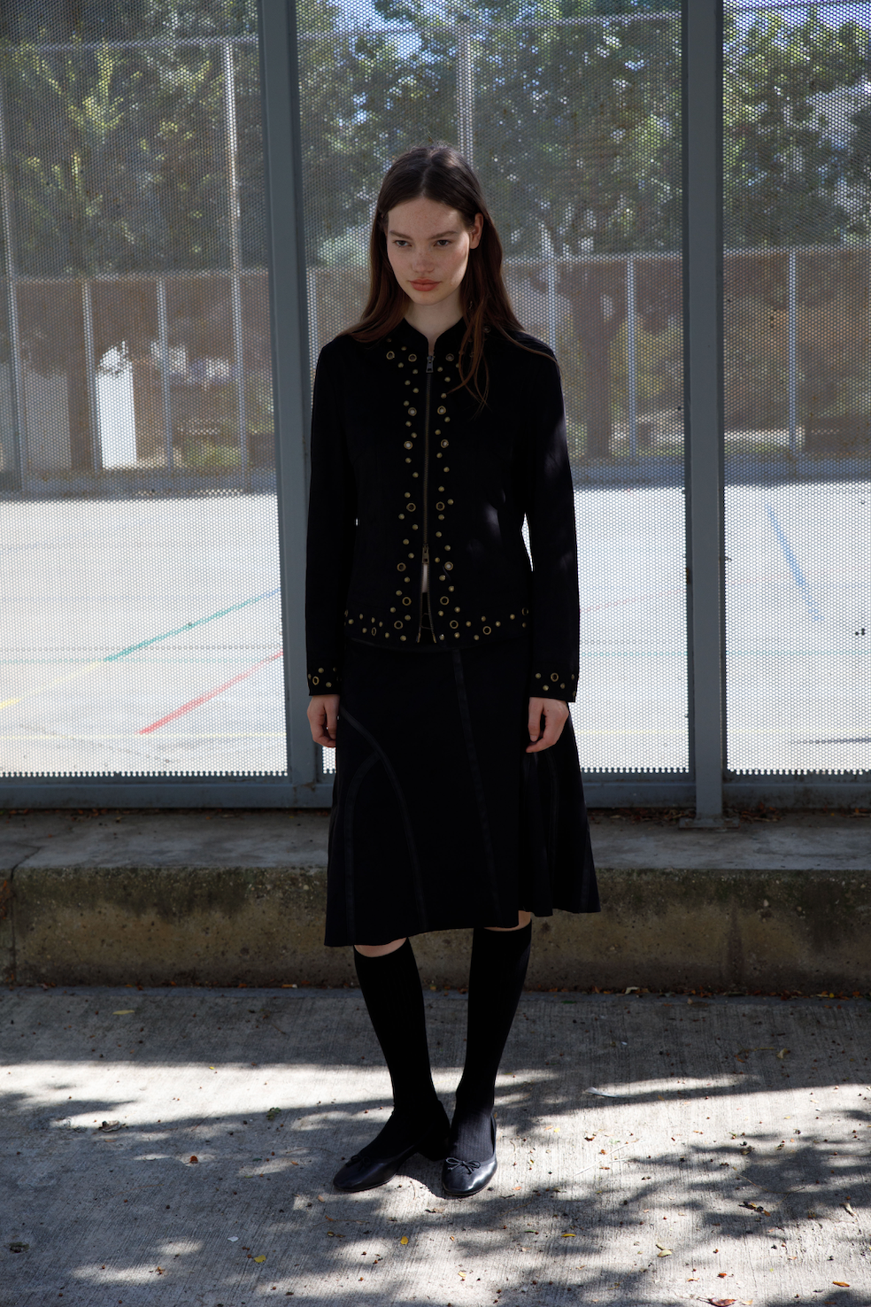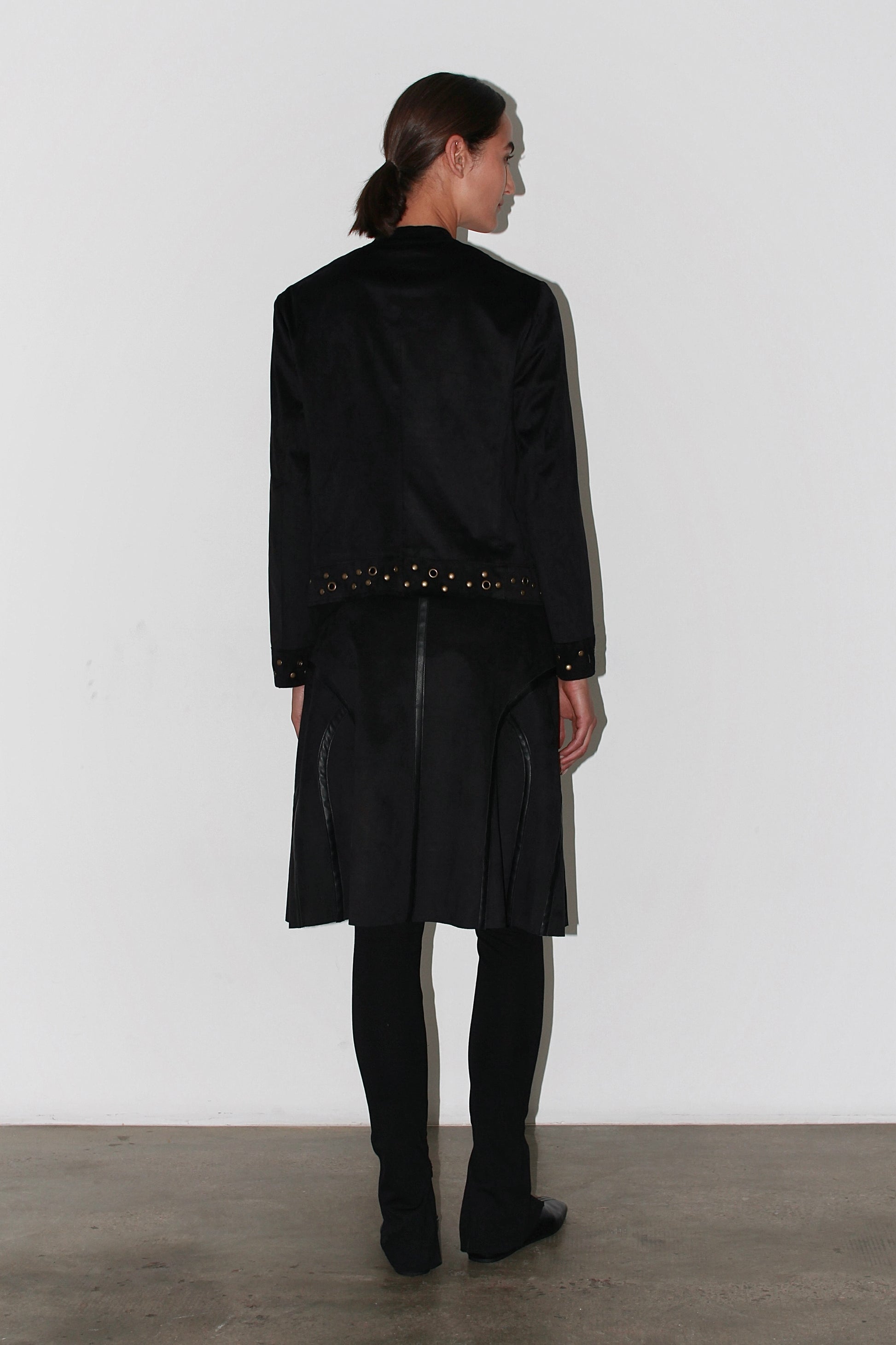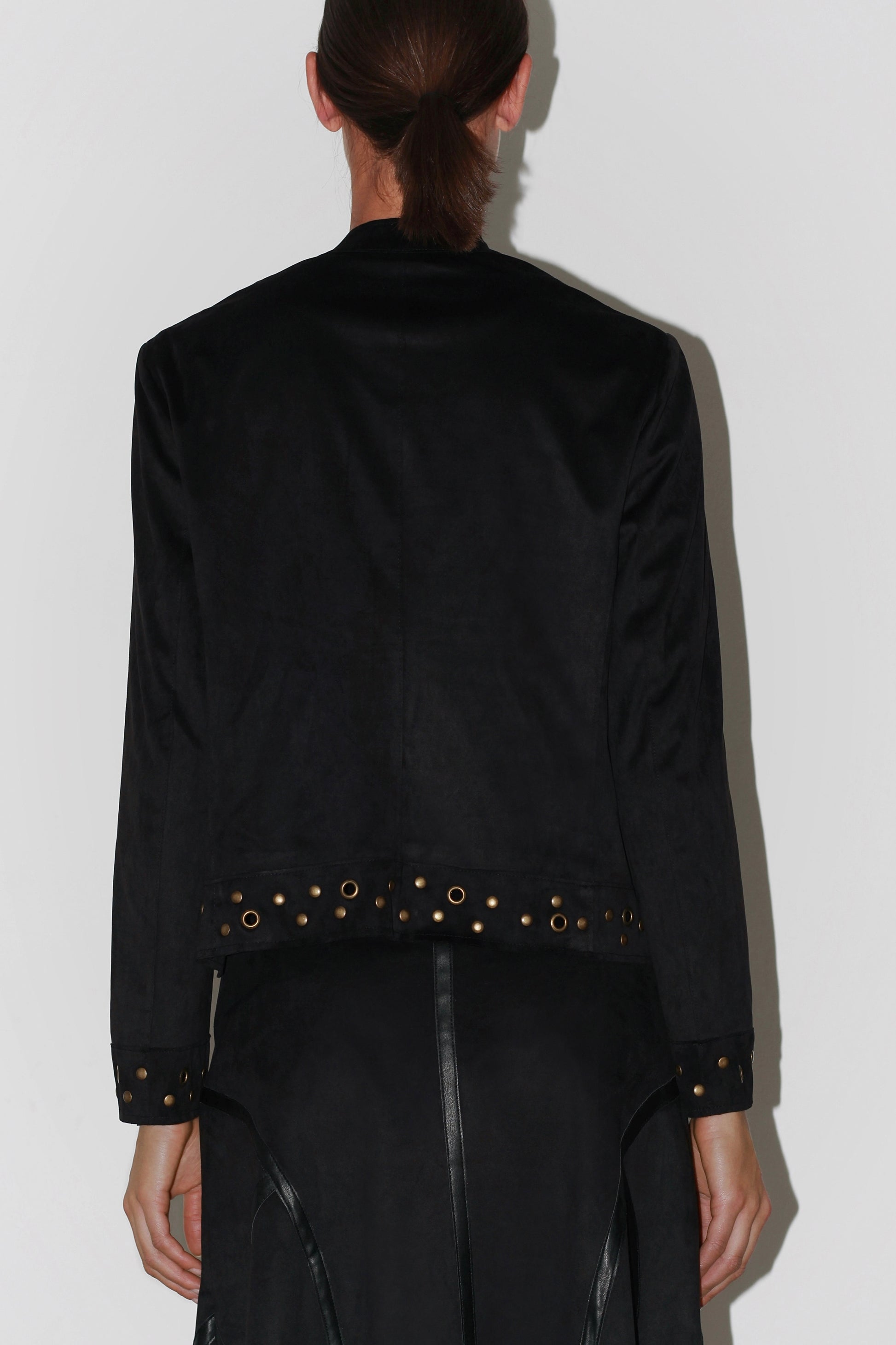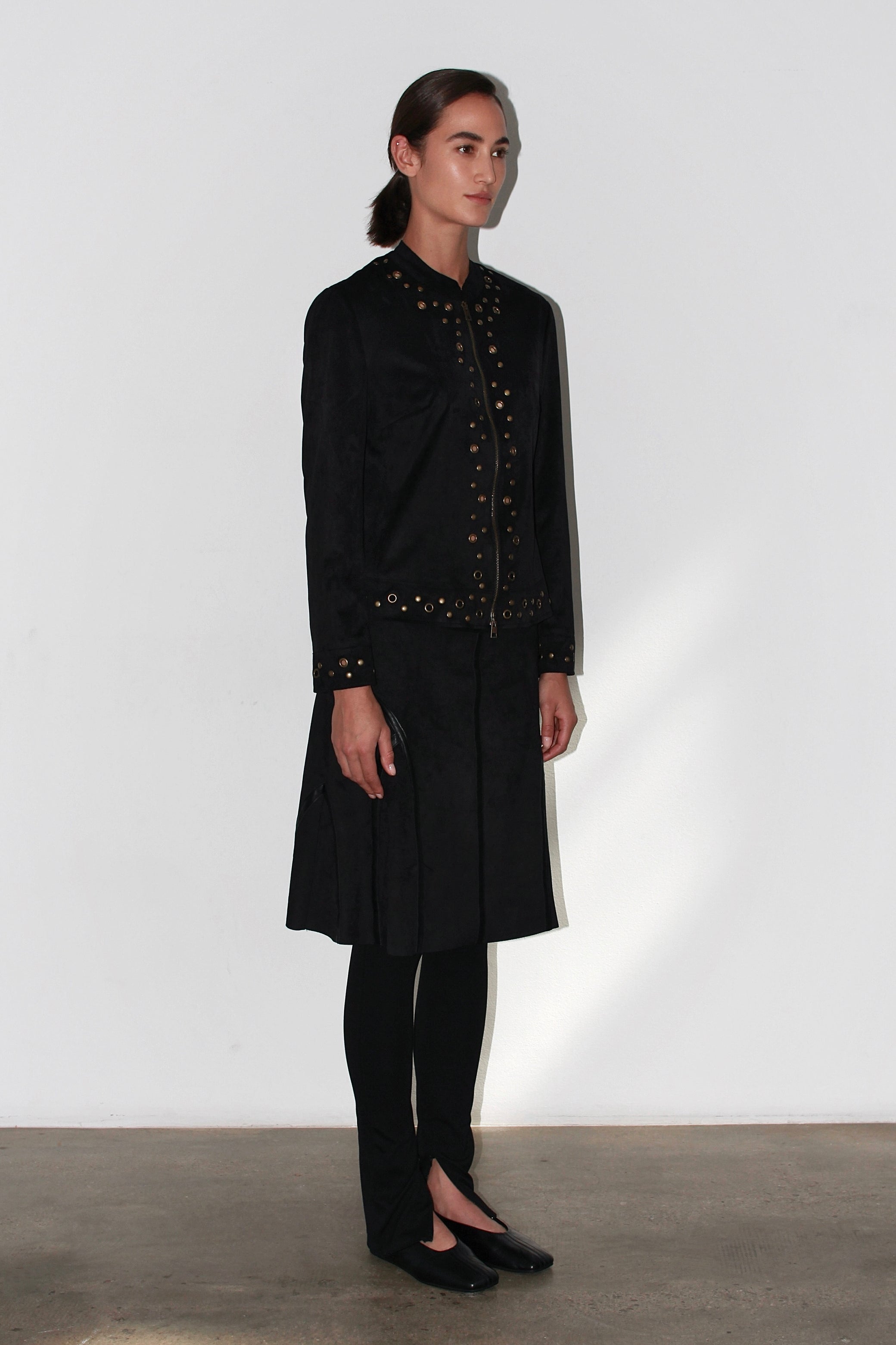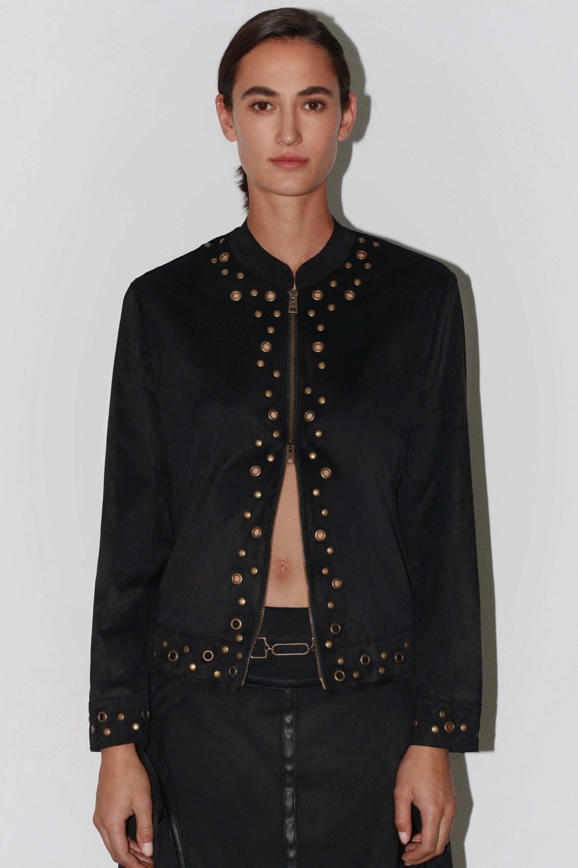 Fitted jacket made in a chocolate brown suede fabric, featuring gold stud detailing and a dual-zip front.