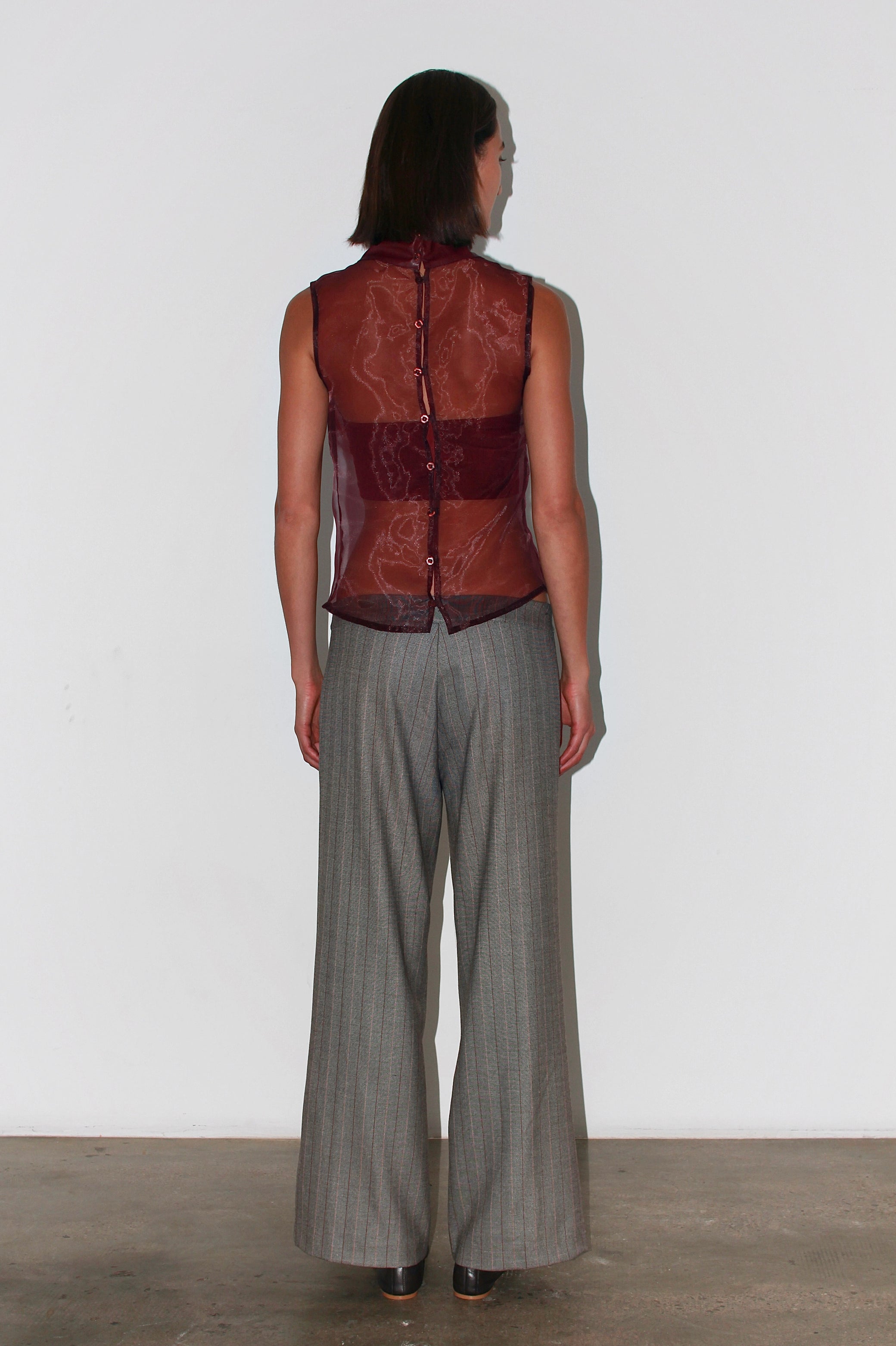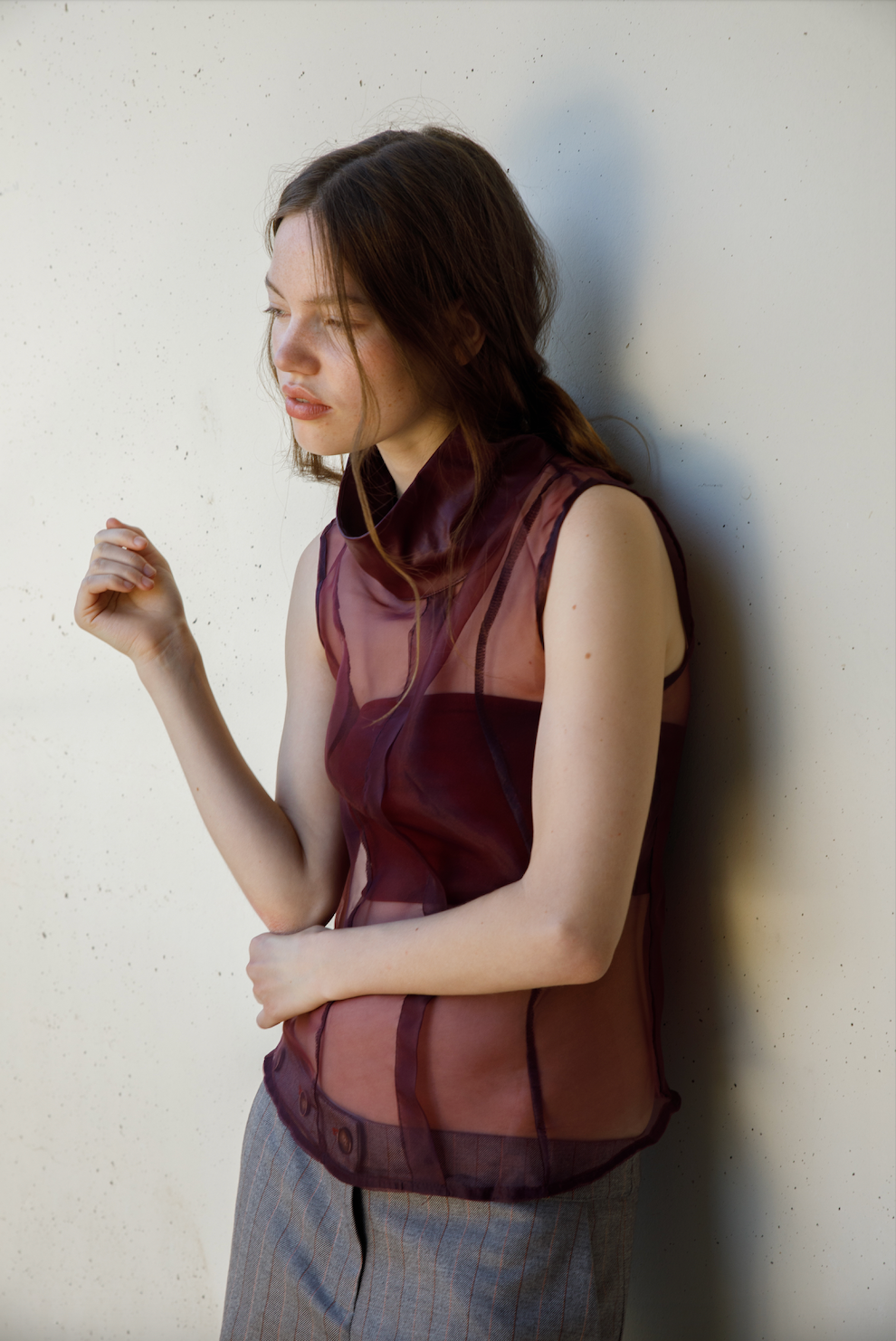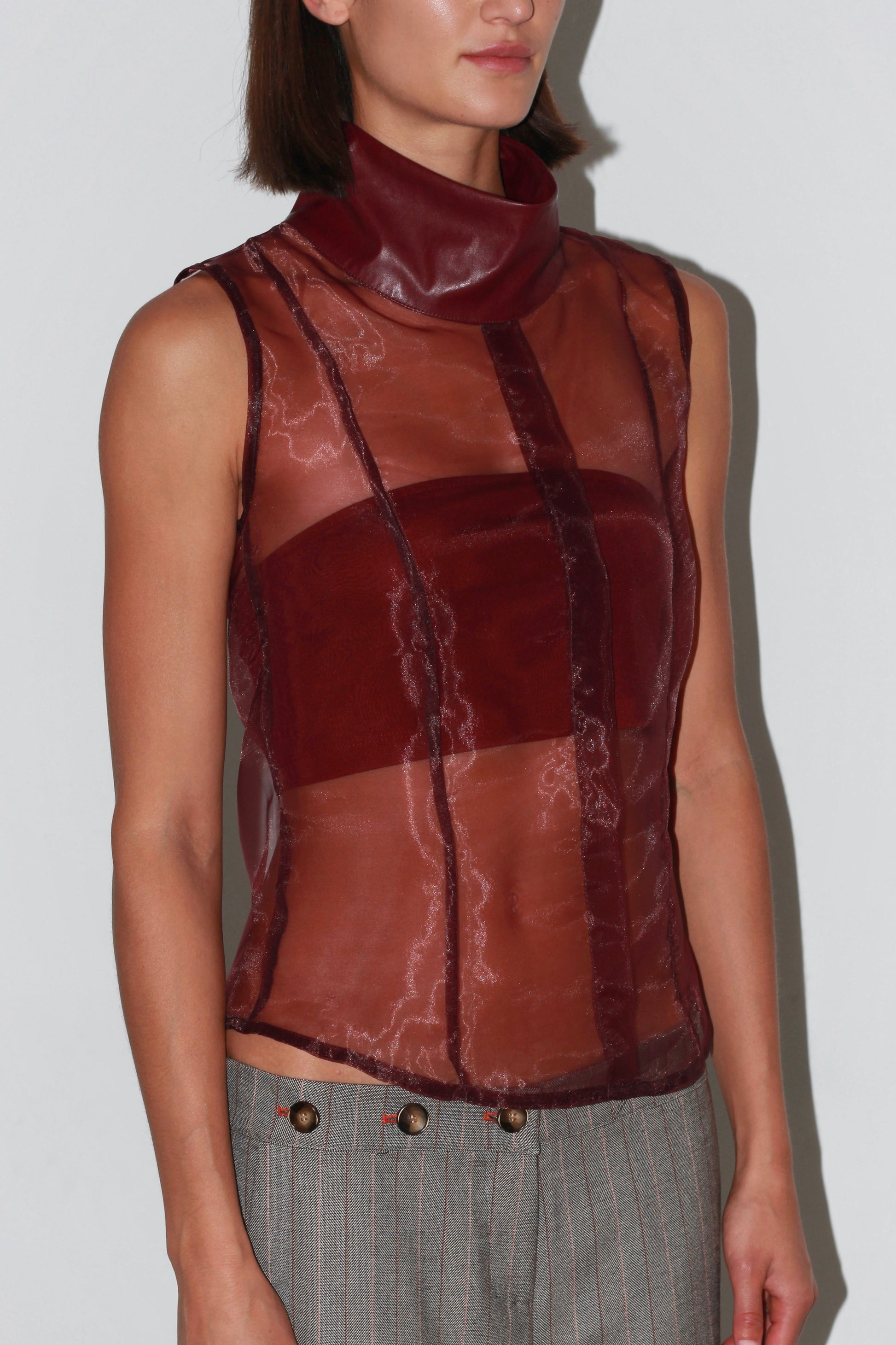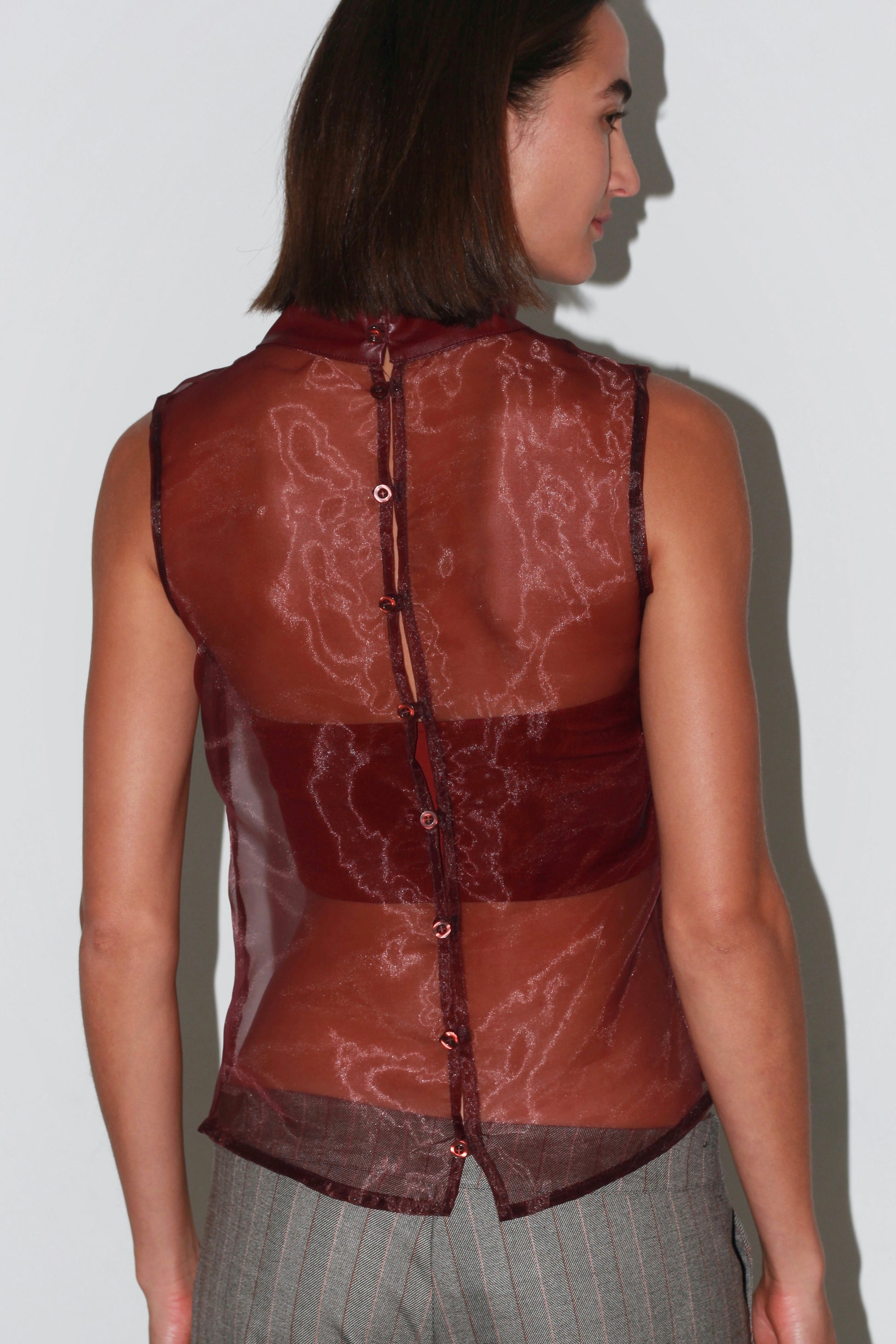 Sheer burgundy asymmetric organza sleeveless top with a structured high collar and visible seam detailing. Features a button fastening along the back. Made in Italy.