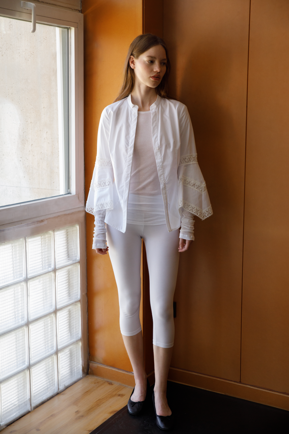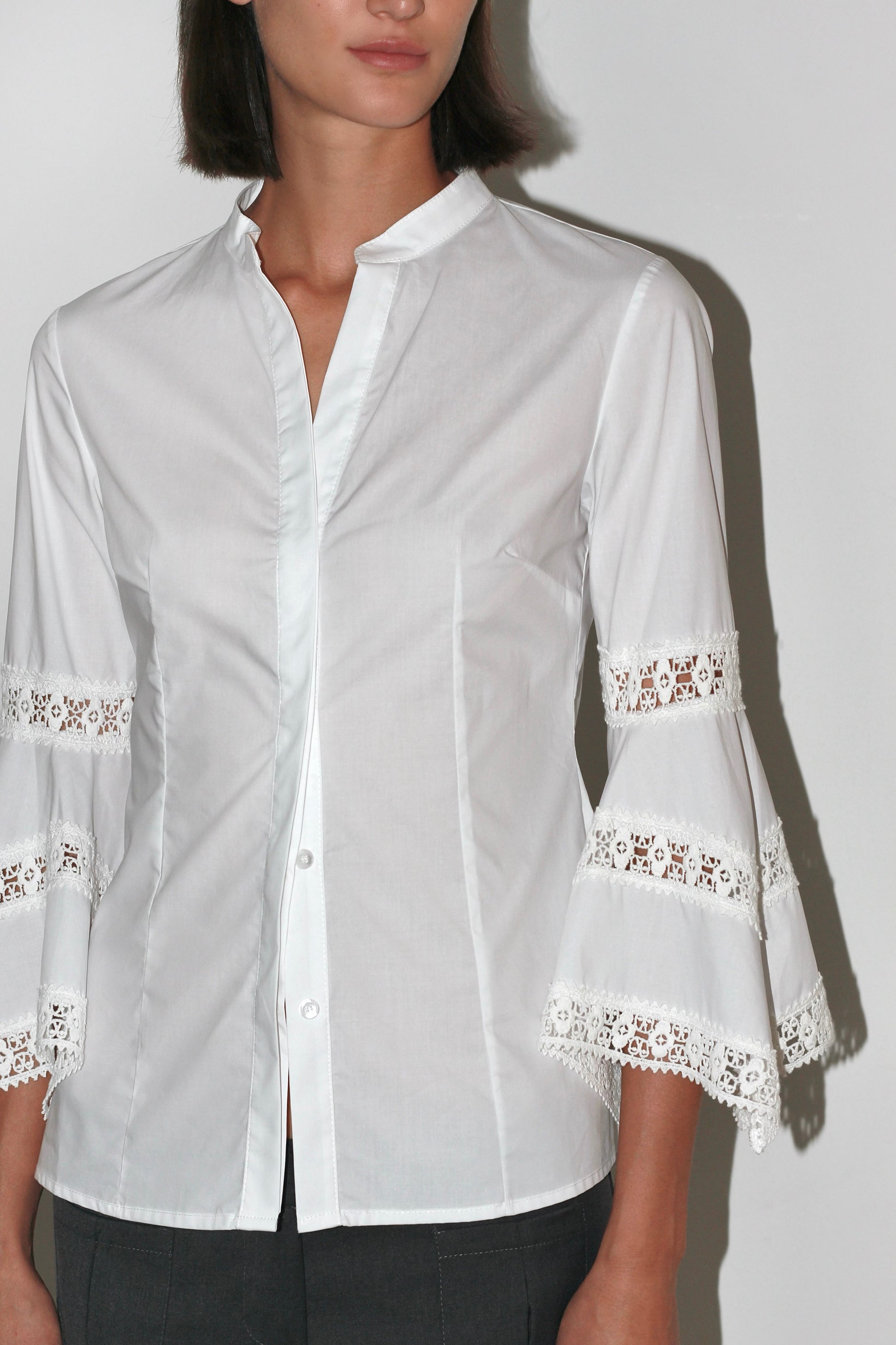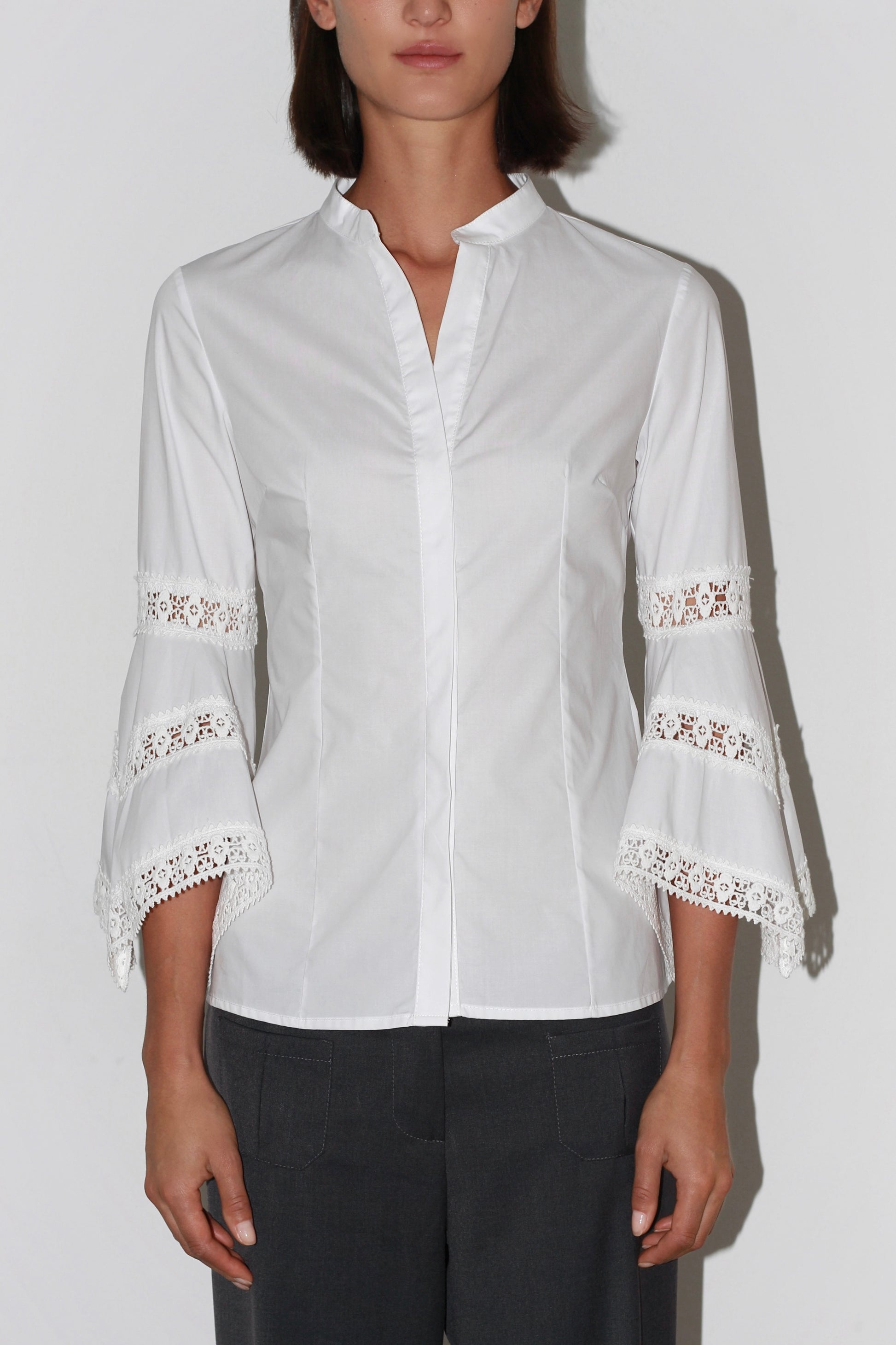 Fitted white cotton shirt with lace-insert flared sleeves and a collarless neckline. Made in Italy.
