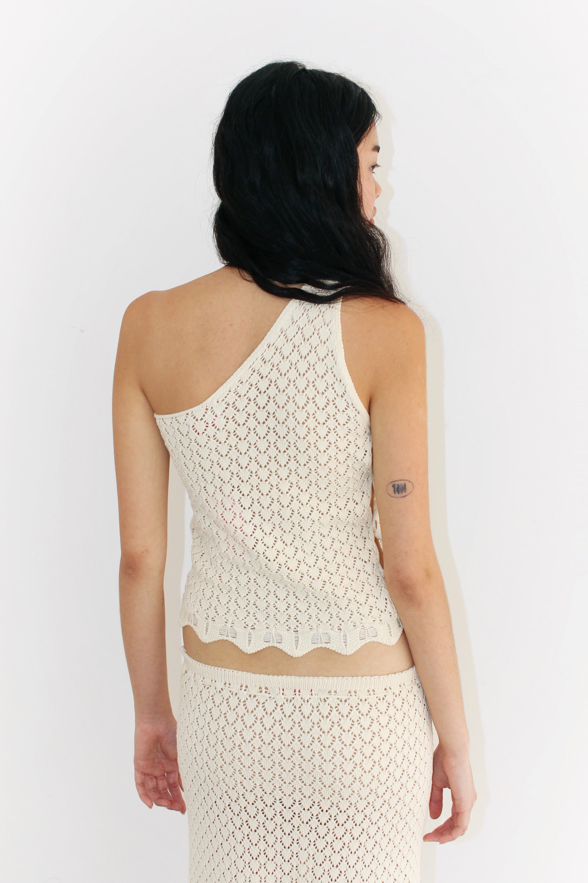 Asymmetrical one shoulder knit panna top with side buttons. Made in Italy.