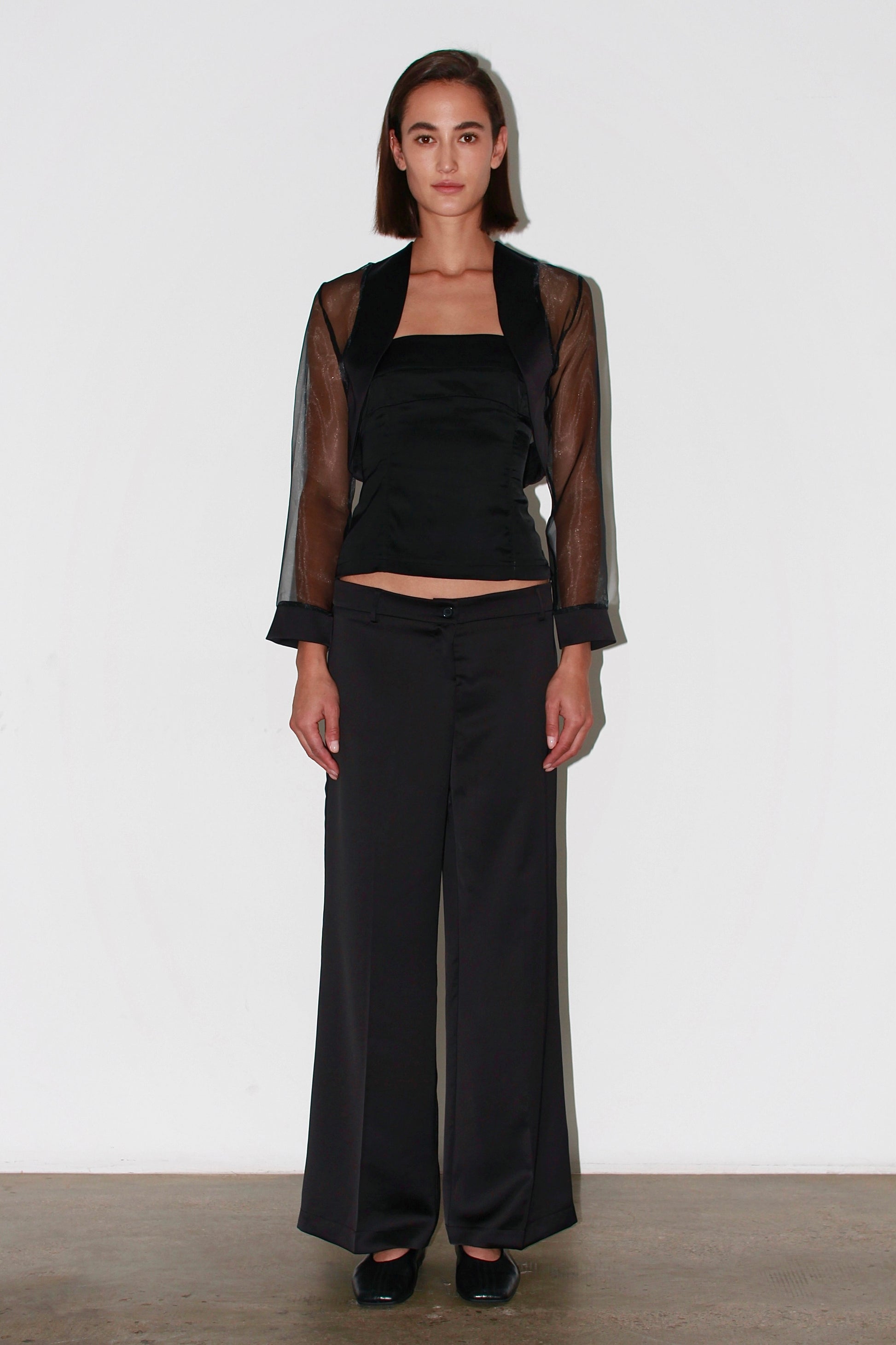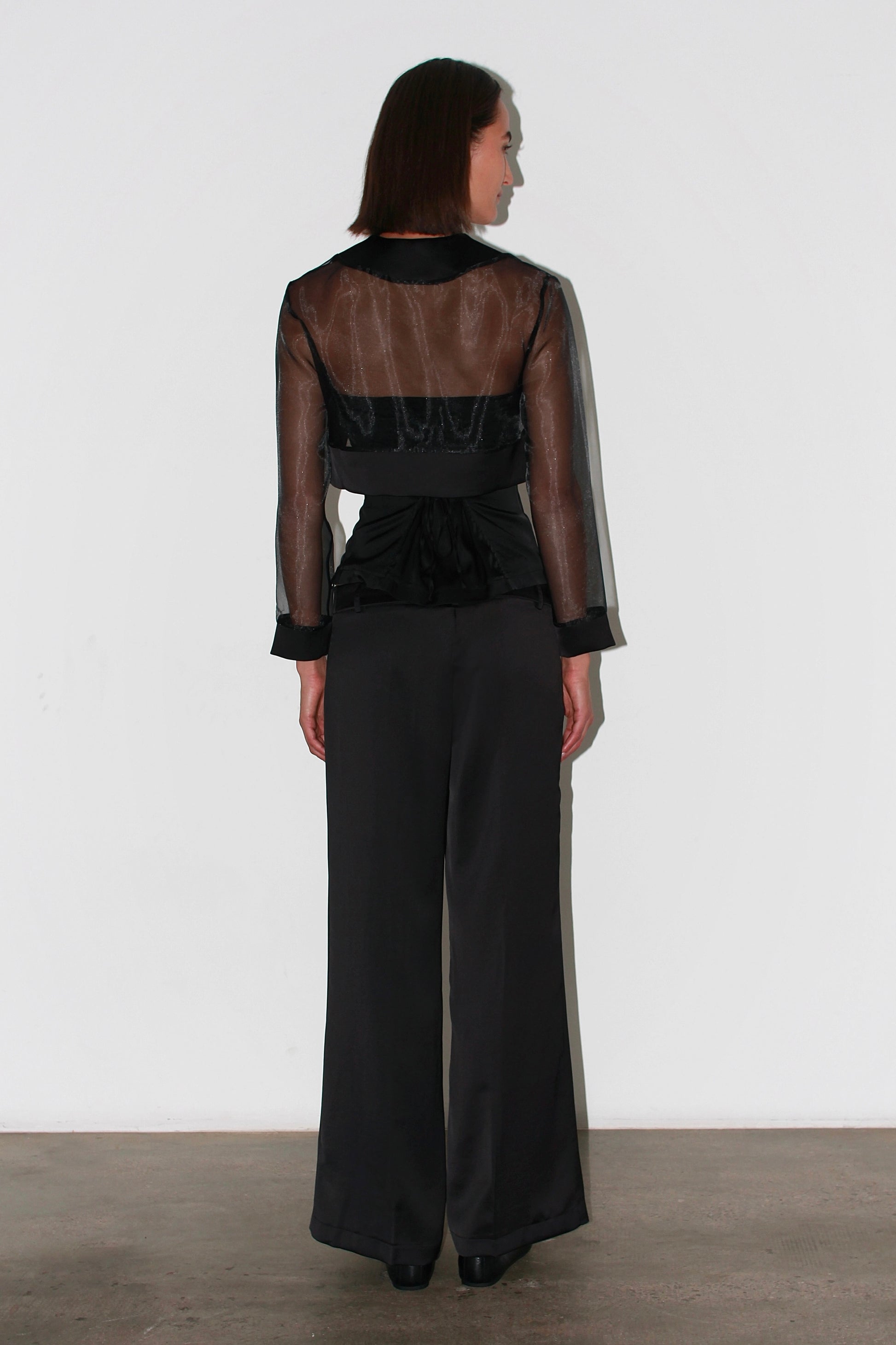 Low-rise black wide-leg trousers with a fluid drape and tailored finish. Made in Italy.