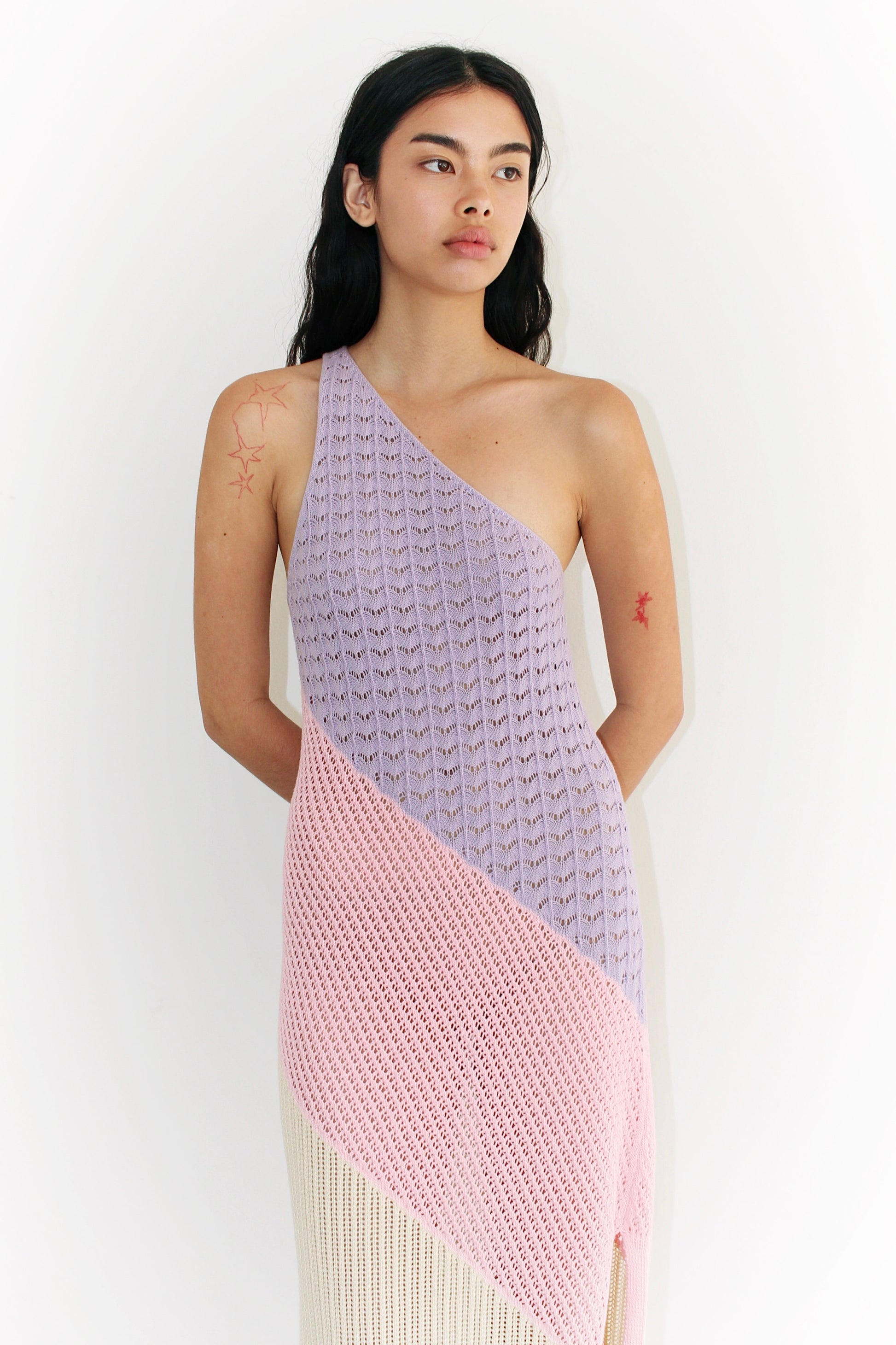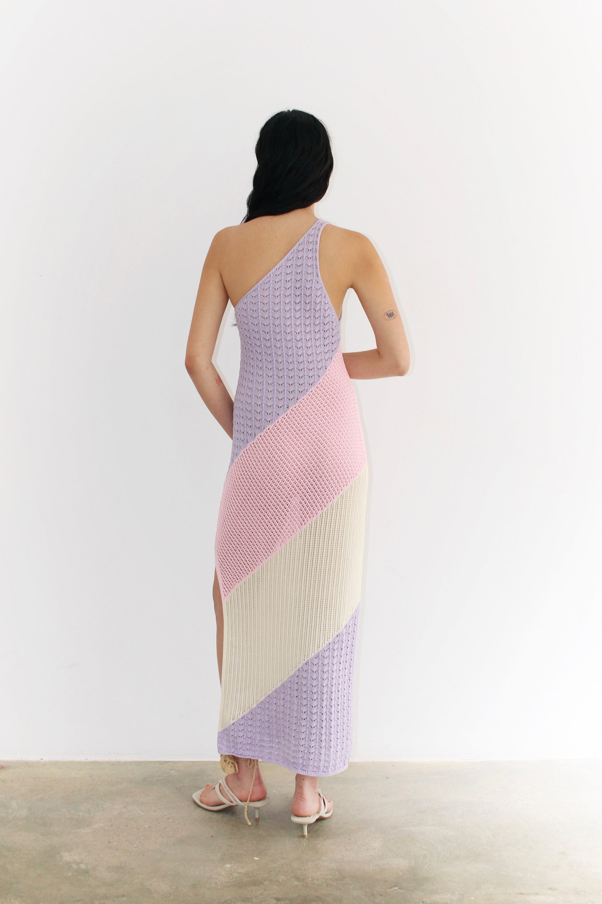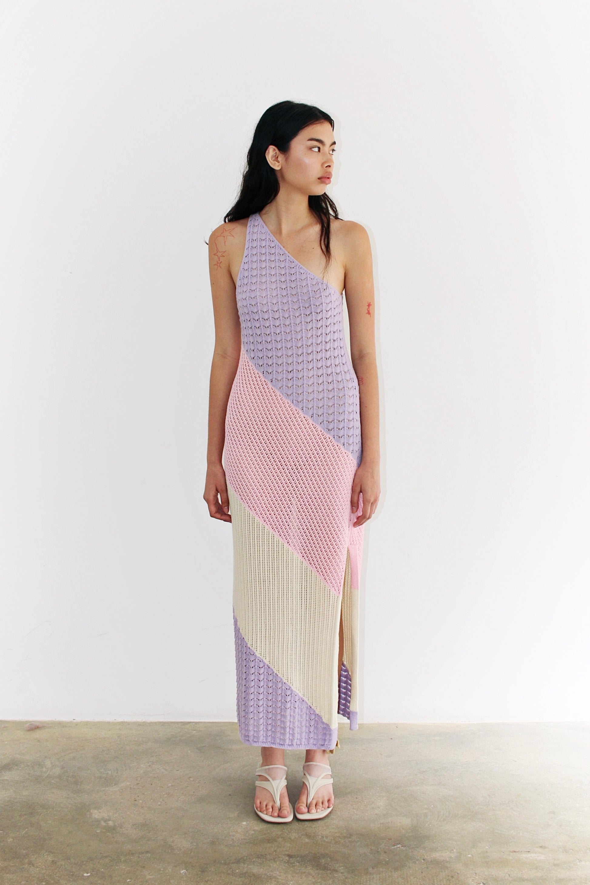 Asymmetrical, one shoulder tri-color knit dress. Made in Italy.