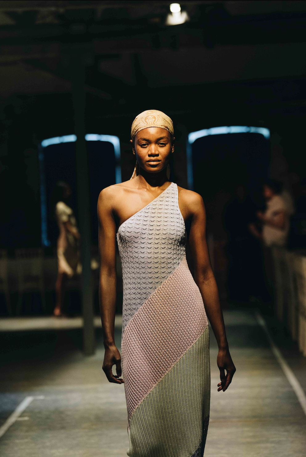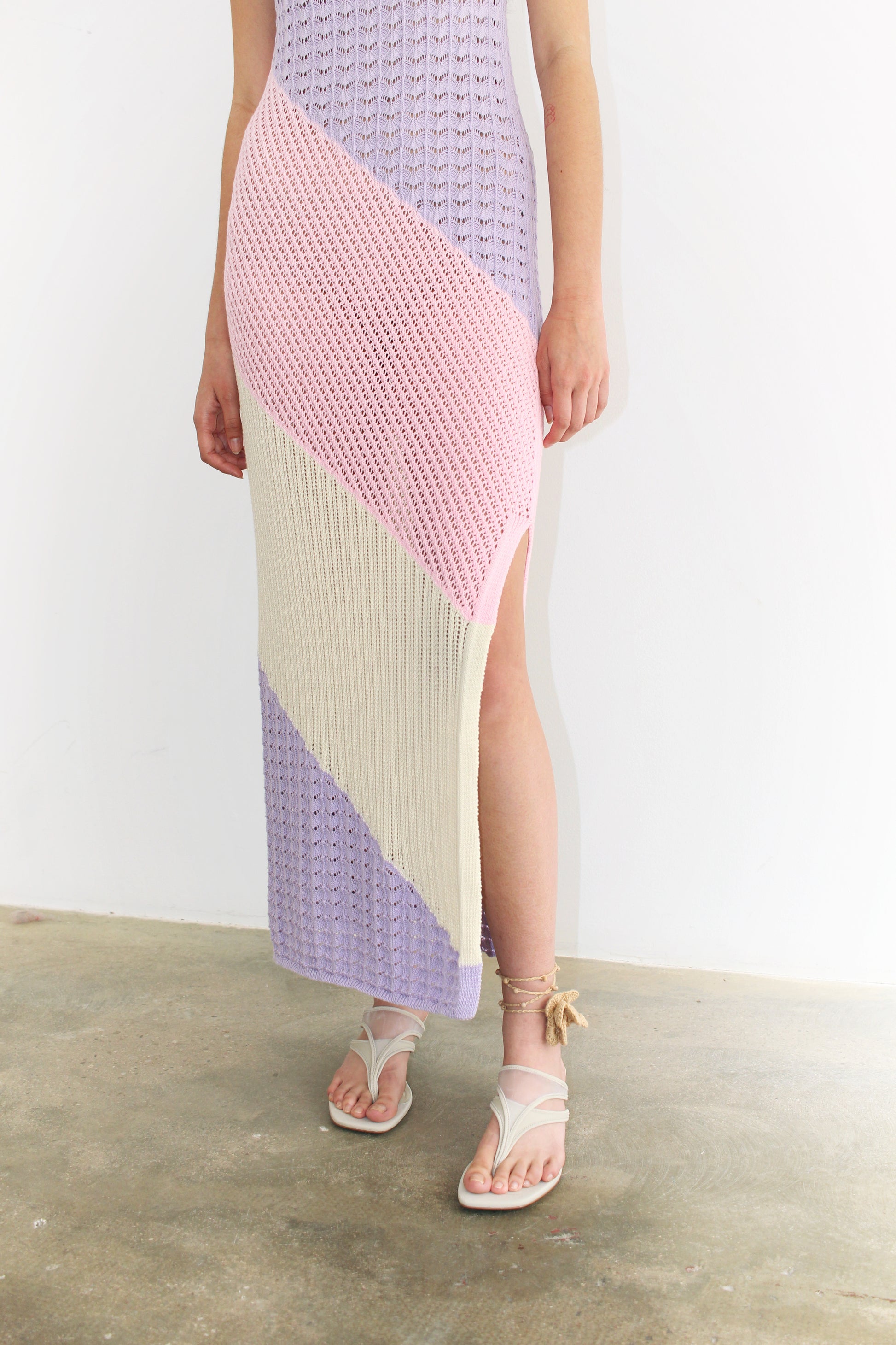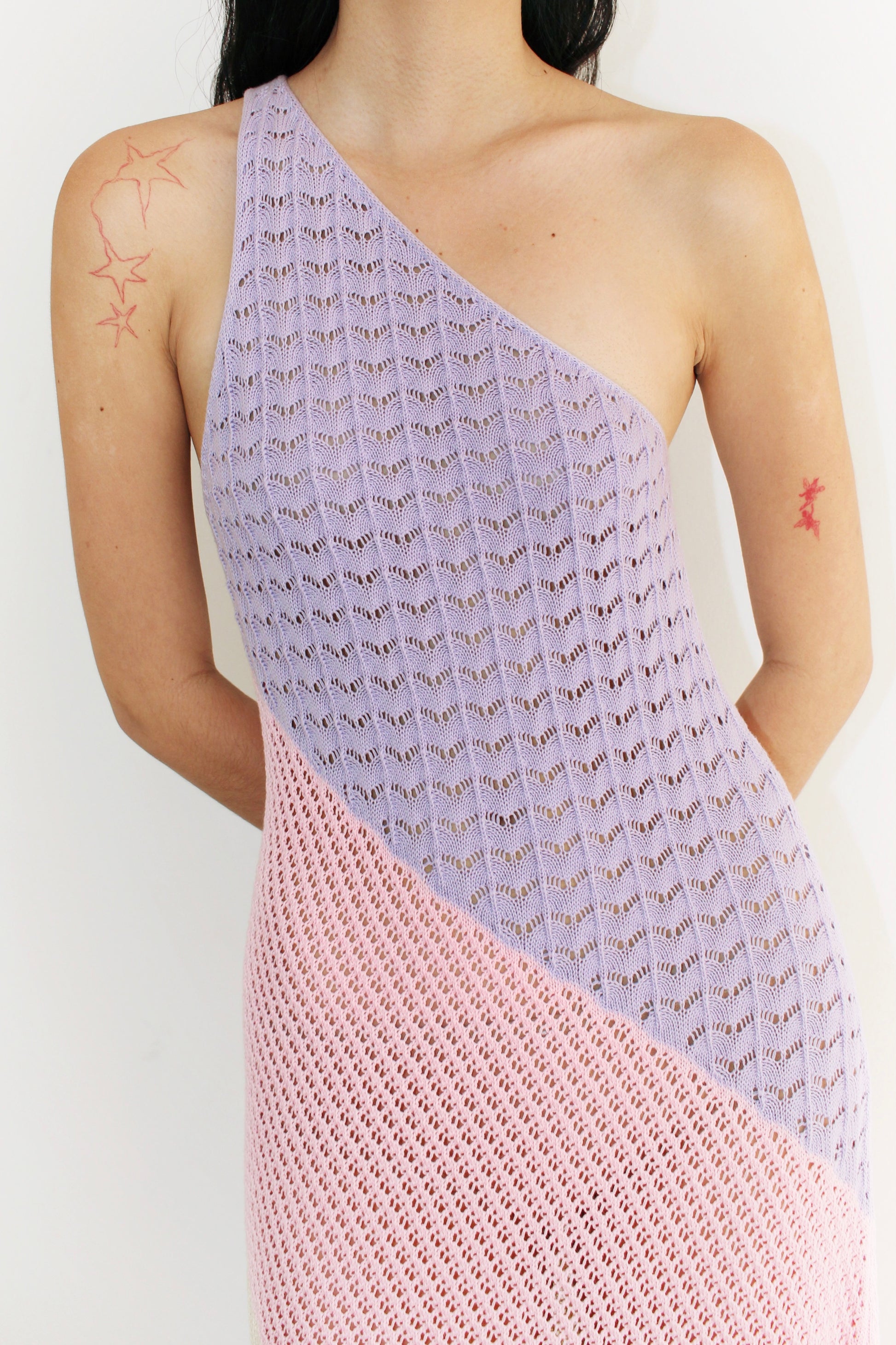 Asymmetrical, one shoulder tri-color knit dress. Made in Italy.