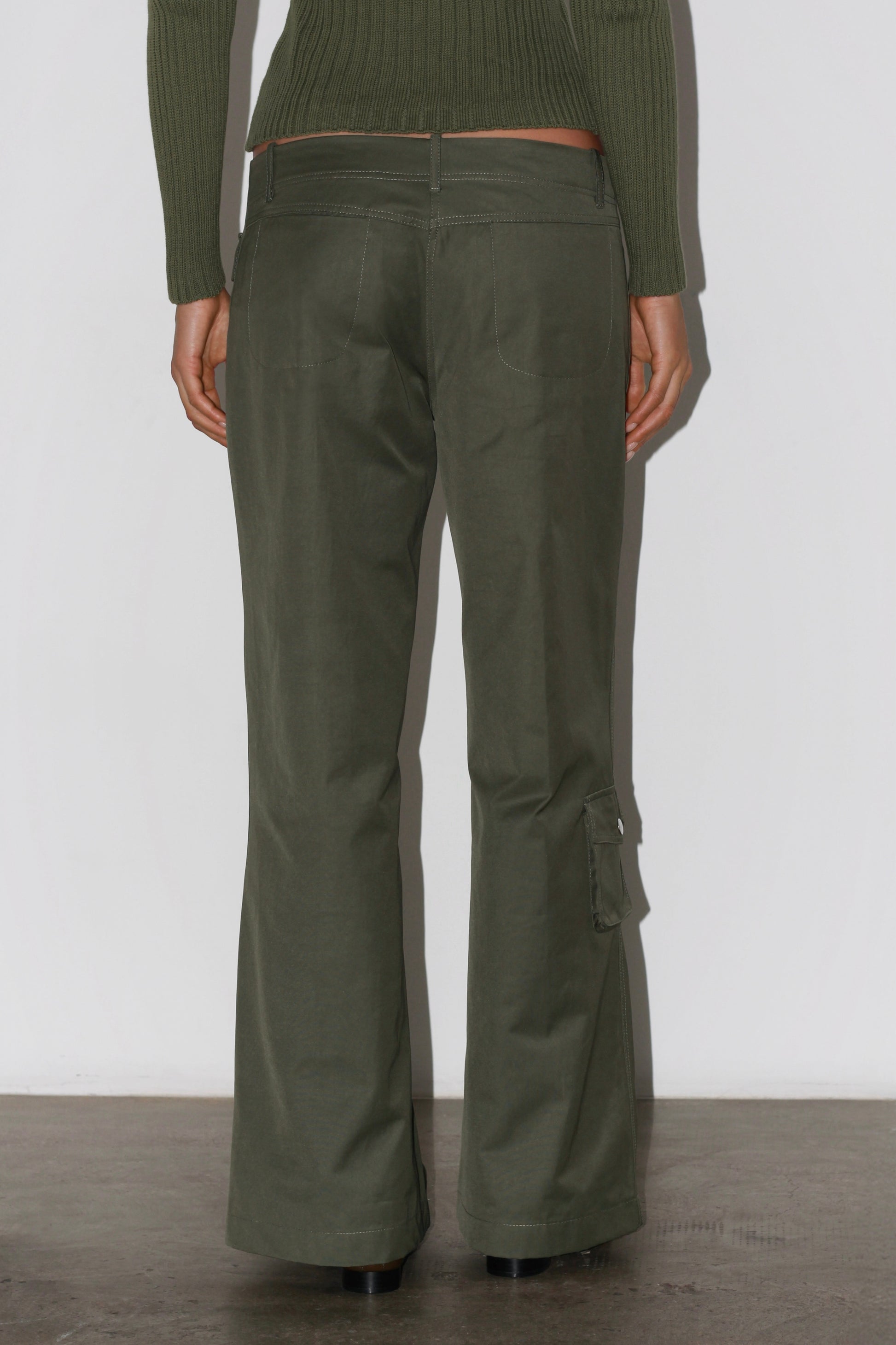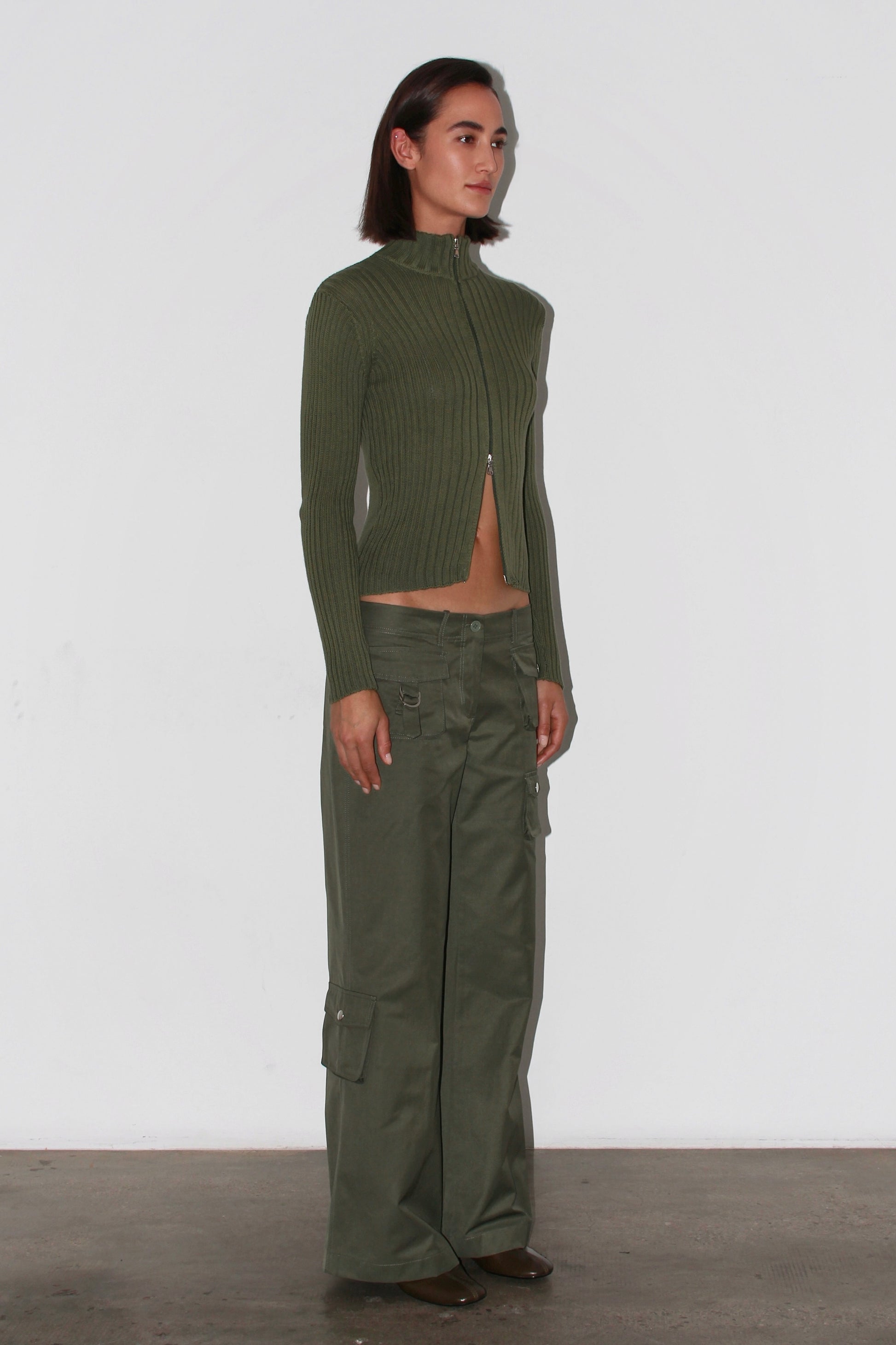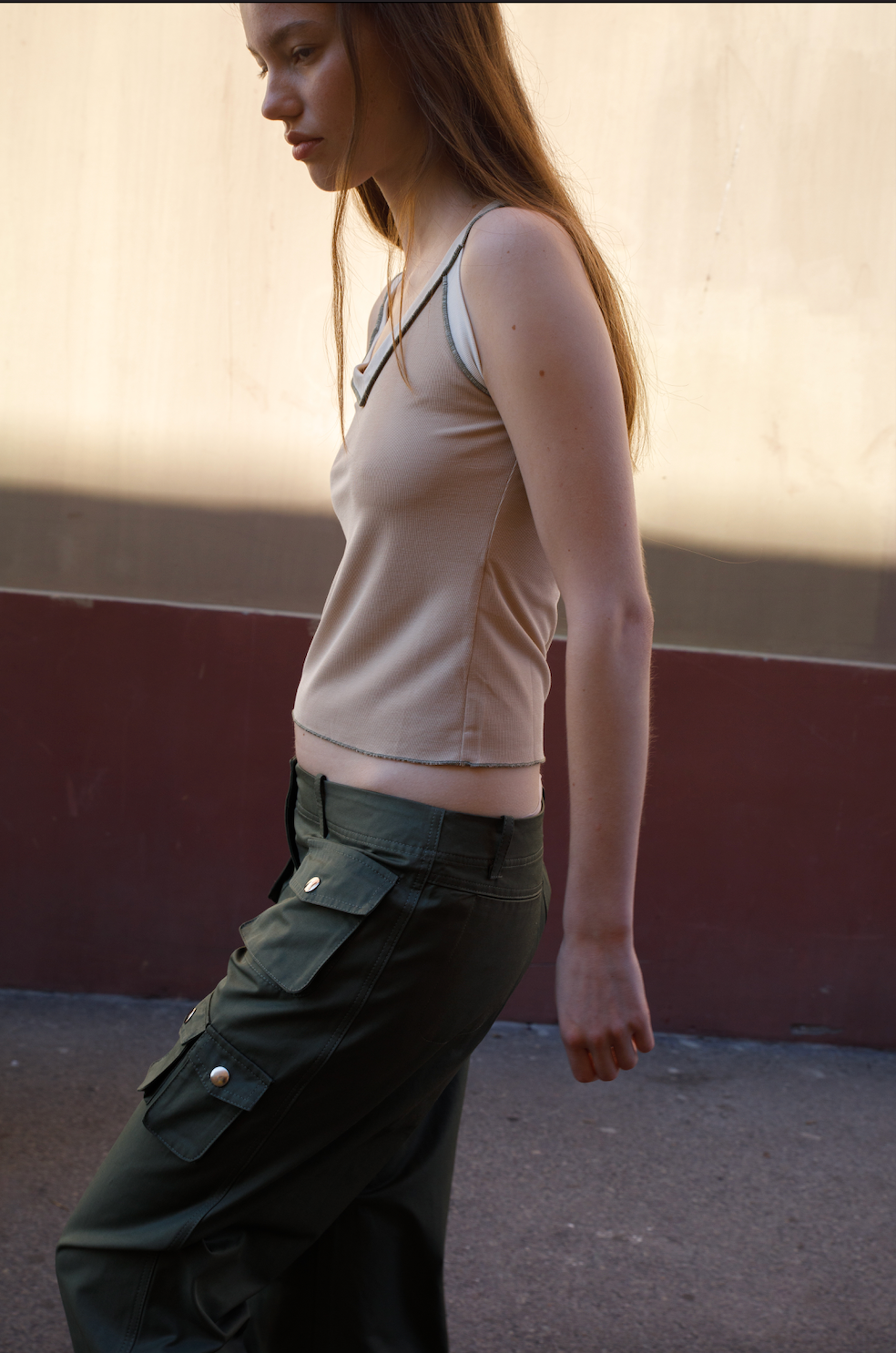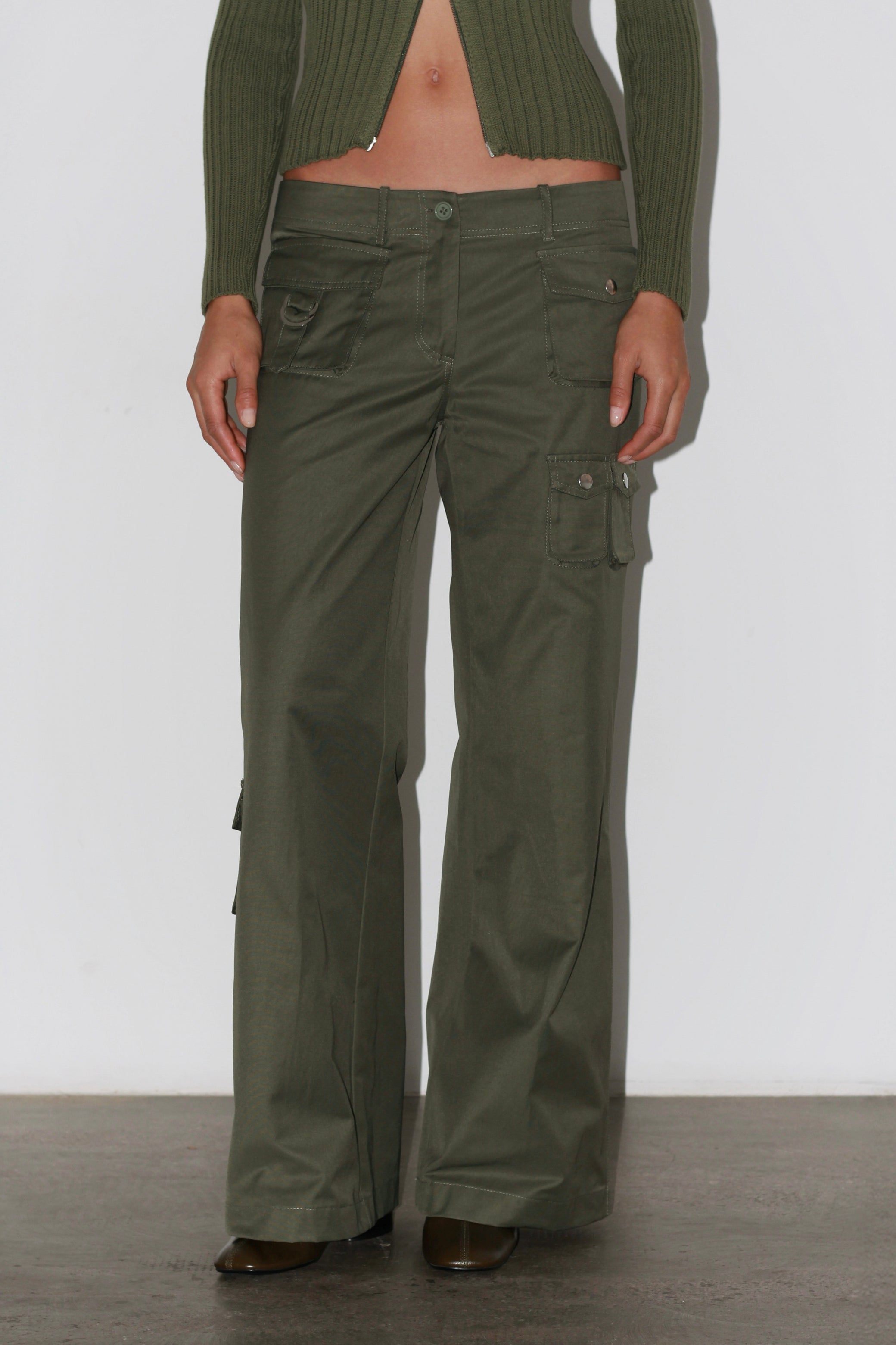 Mid-rise khaki cargo trousers with tonal stitching and utility-inspired pockets. Made in Italy.