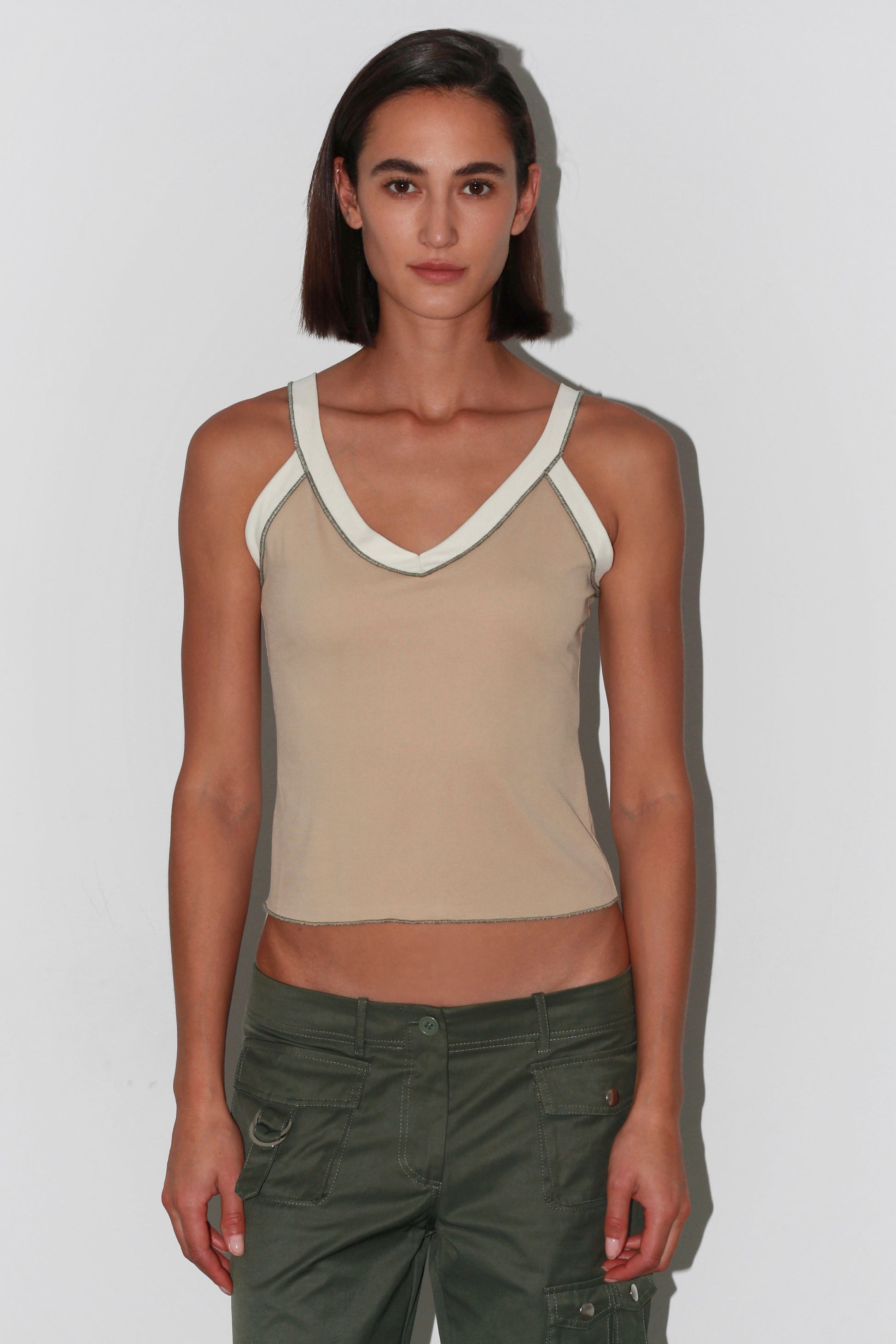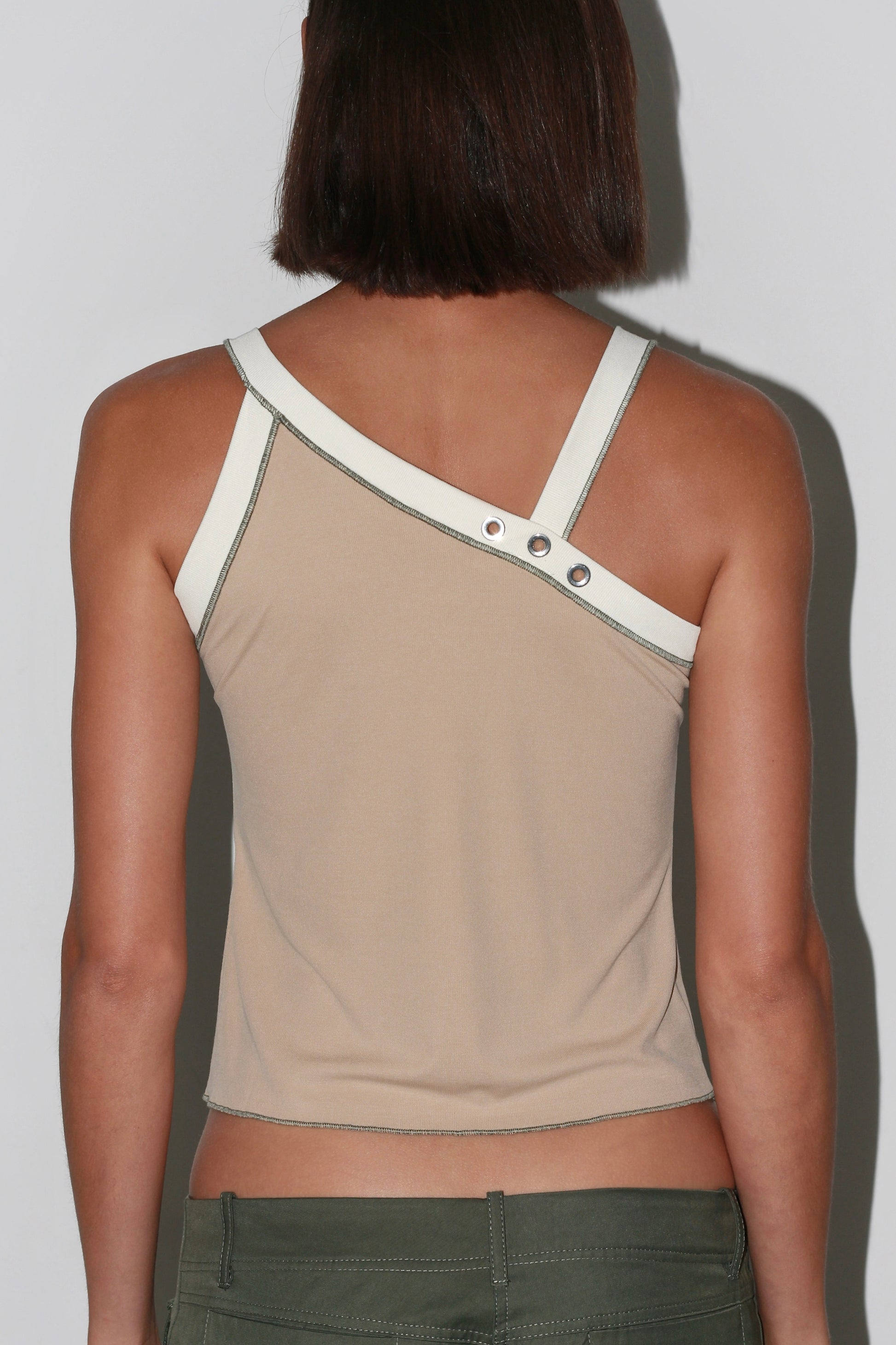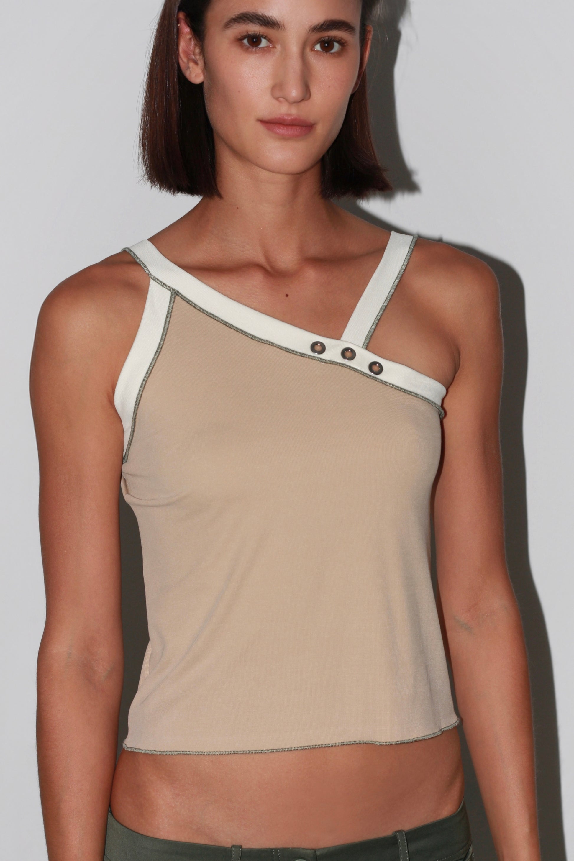 Multiposition top in beige stretch fabric, featuring contrast ivory trim and green exposed stitching. Designed to be worn in two different ways — as an asymmetric neckline or a V-neck silhouette. Made in Italy.