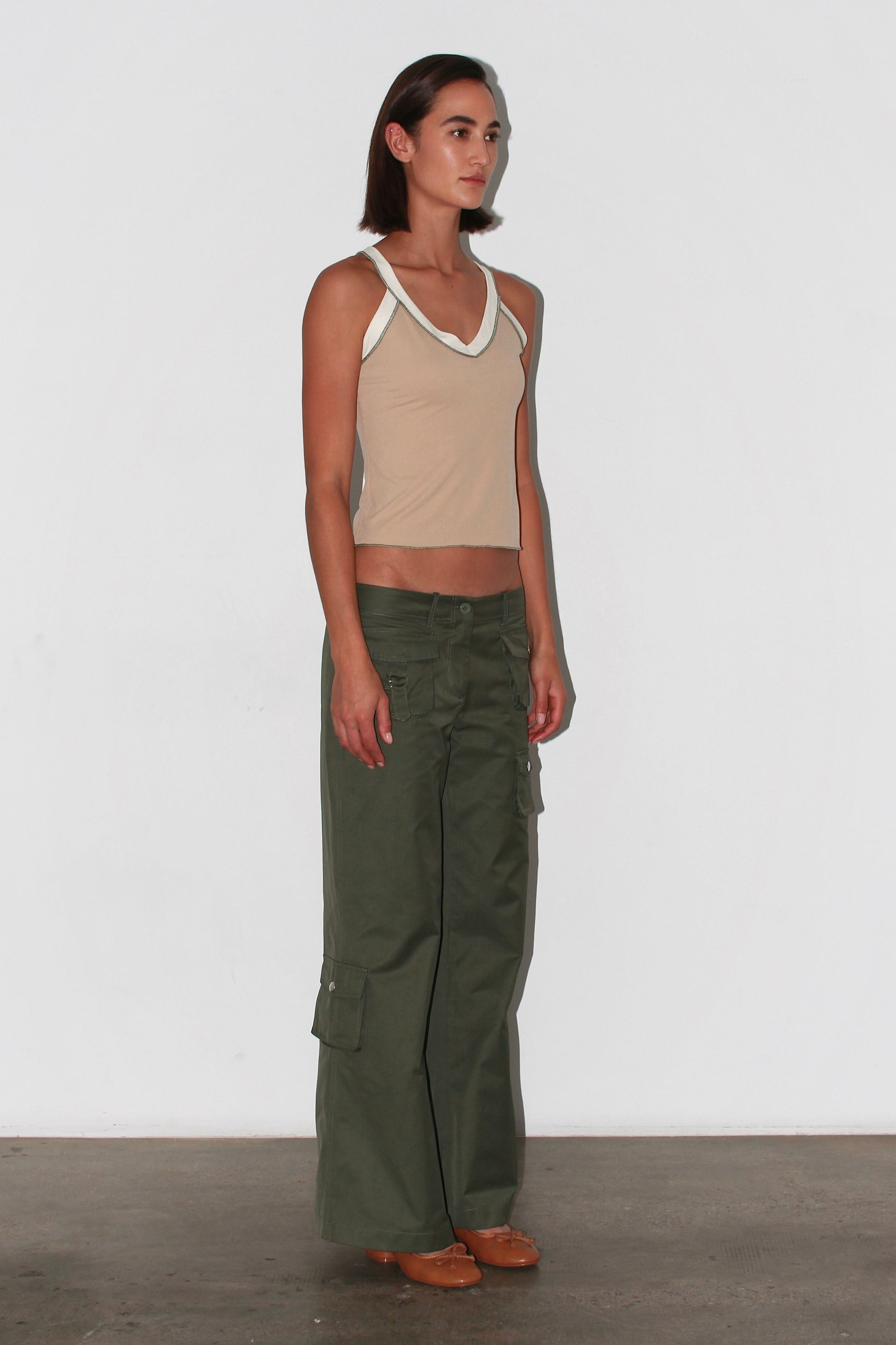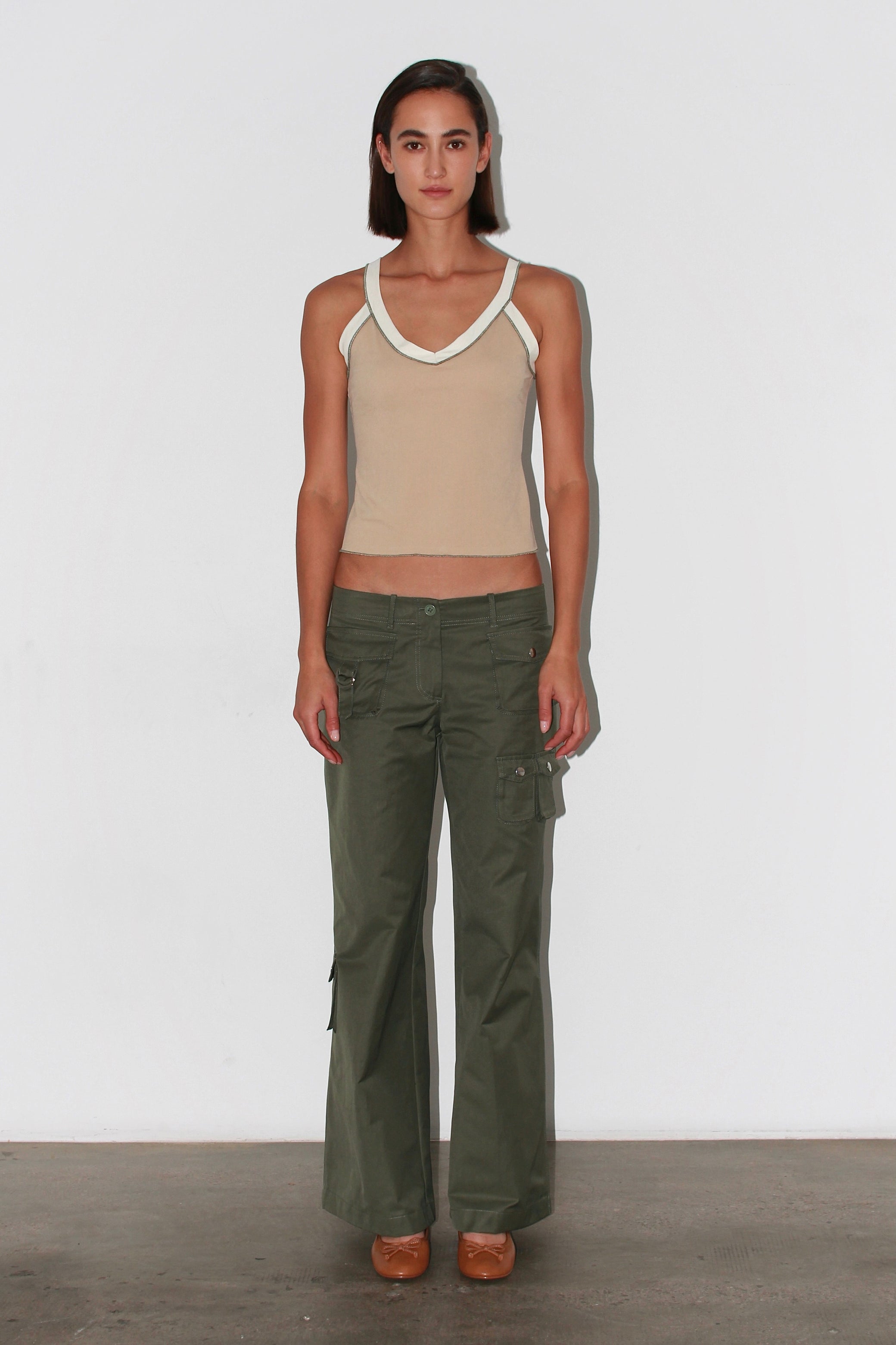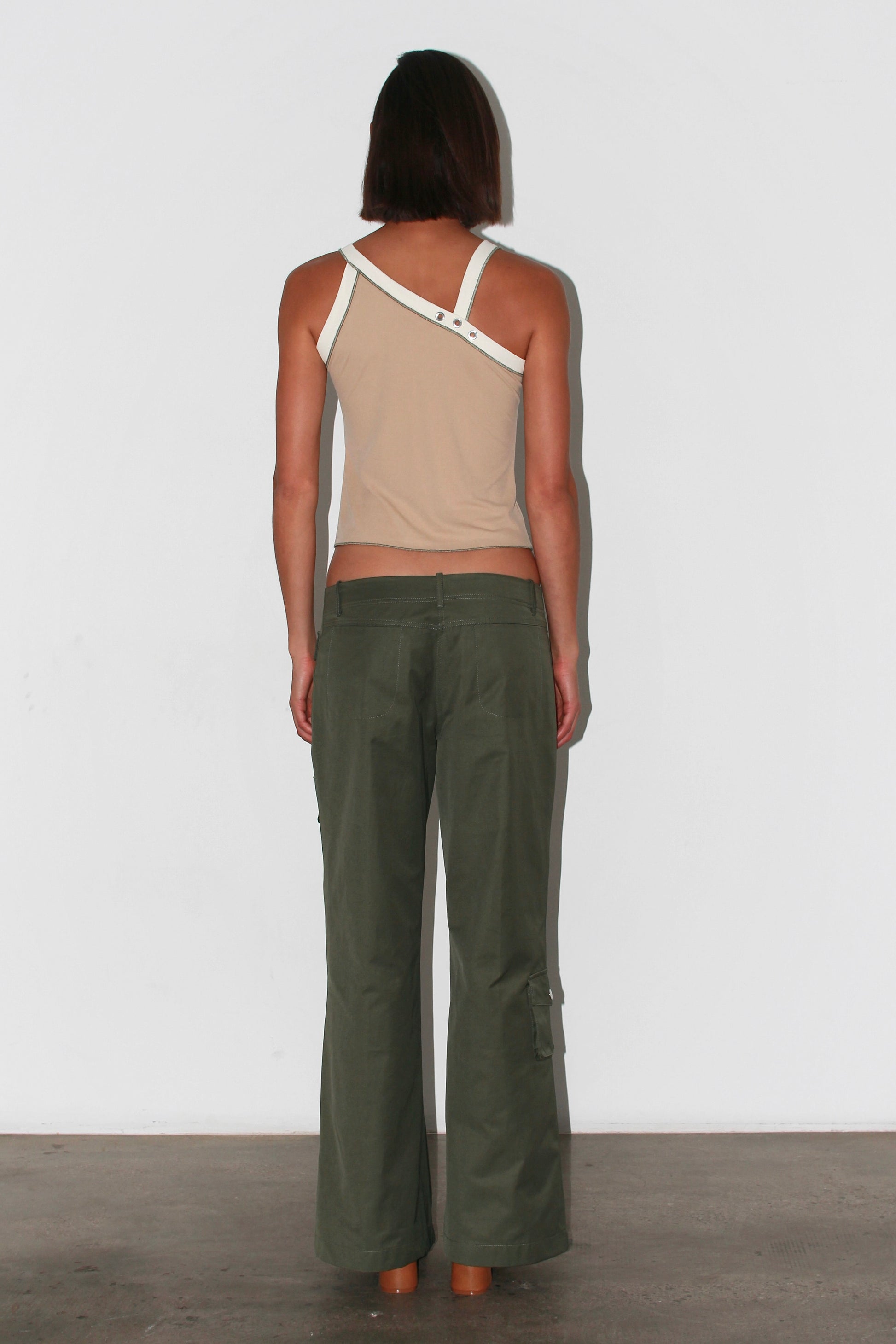 Multiposition top in beige stretch fabric, featuring contrast ivory trim and green exposed stitching. Designed to be worn in two different ways — as an asymmetric neckline or a V-neck silhouette. Made in Italy.