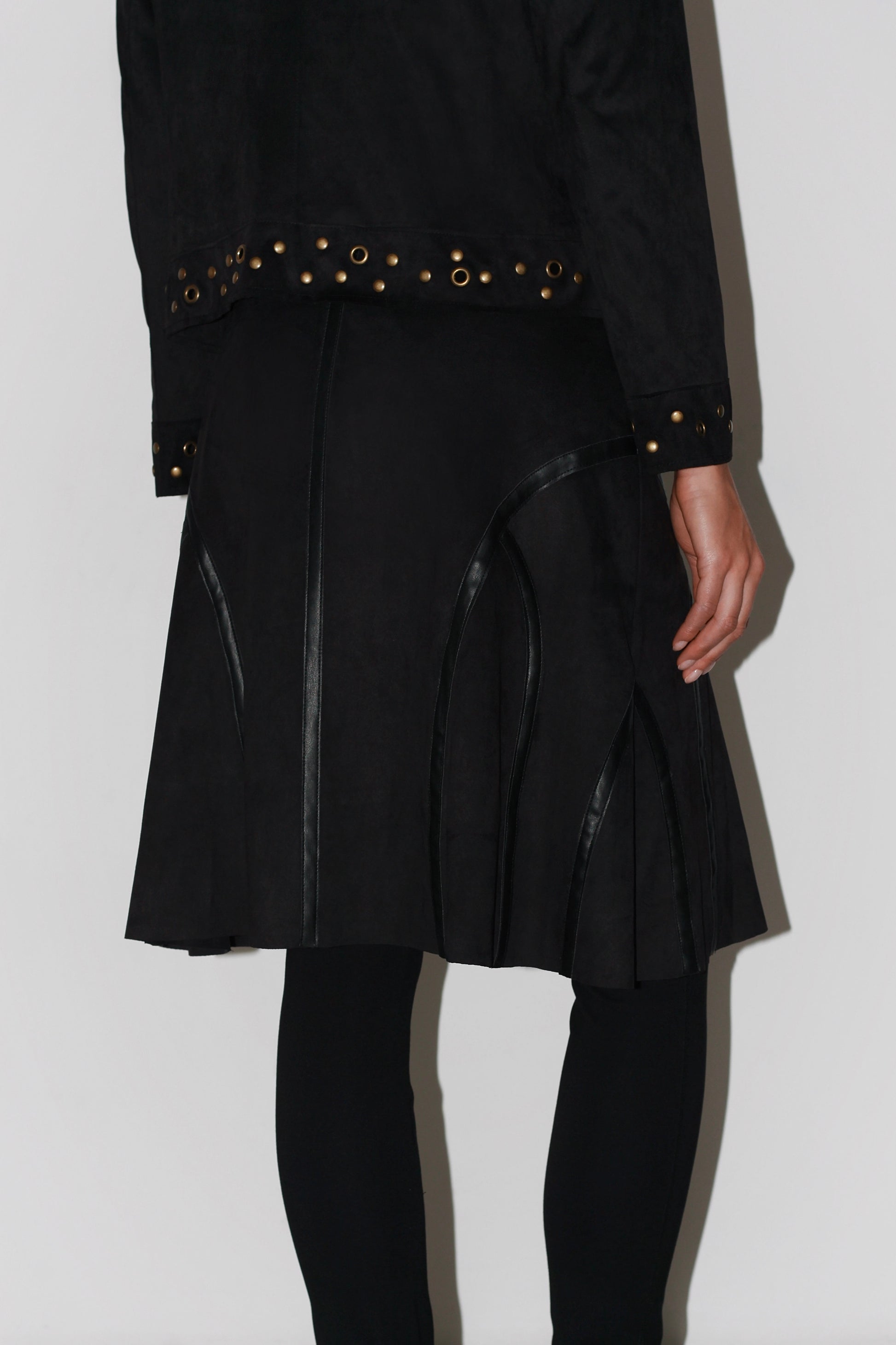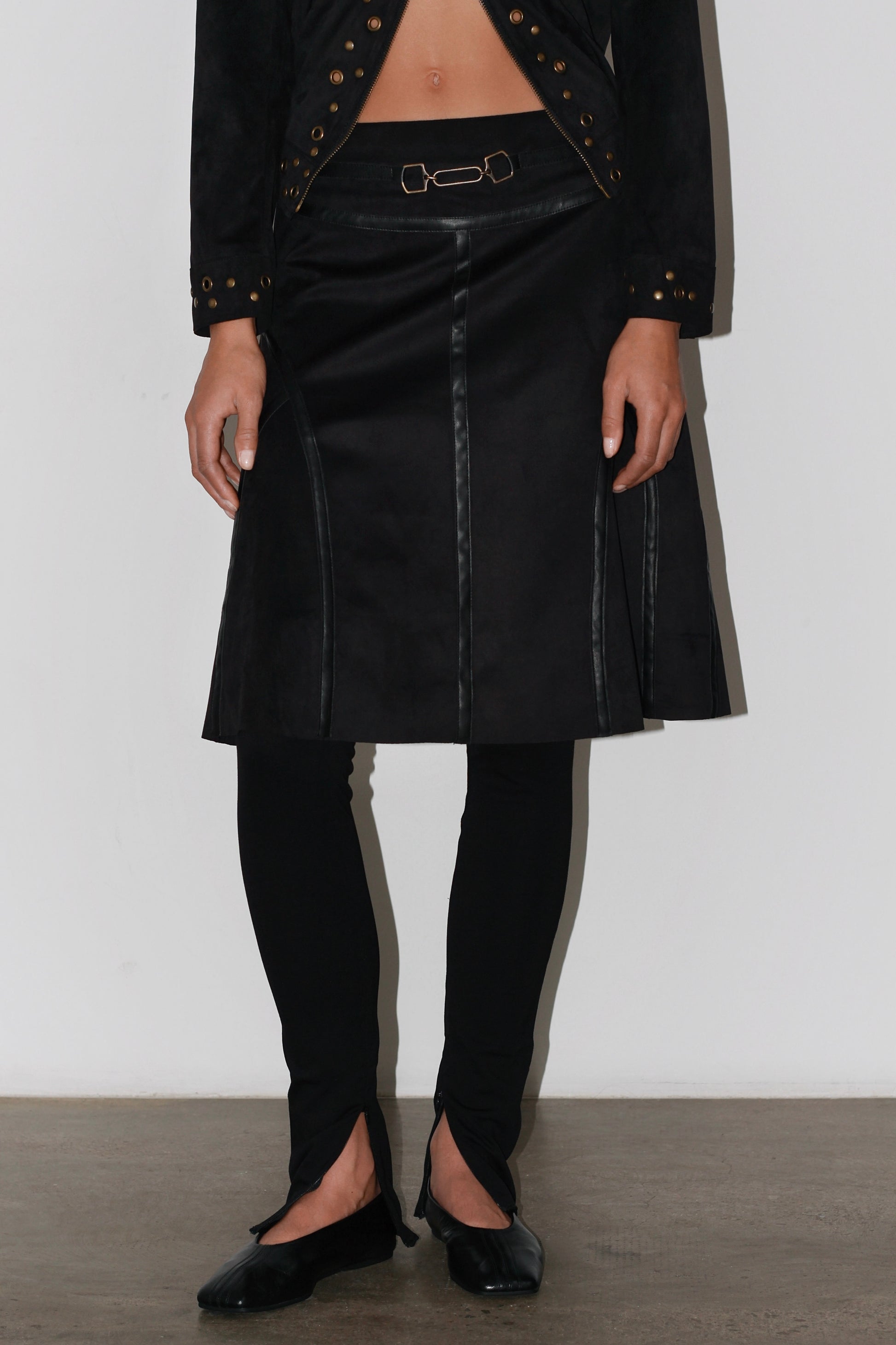 Mid-rise skirt made in a black suede material, featuring an attached belt with a gold buckle and brown leather stripes along the panels. Made in Italy.