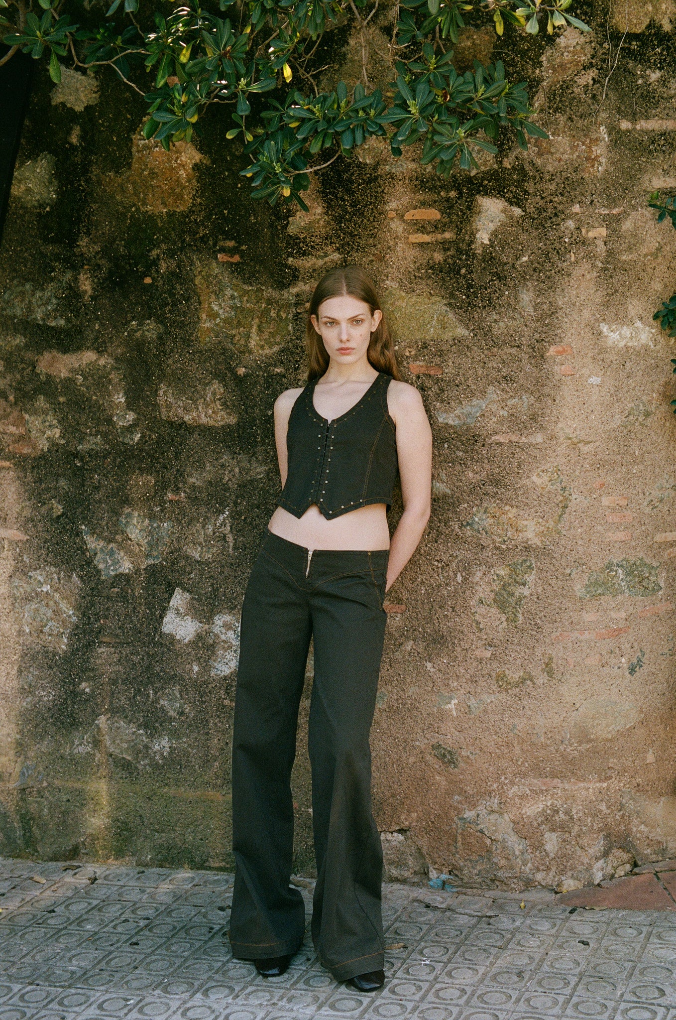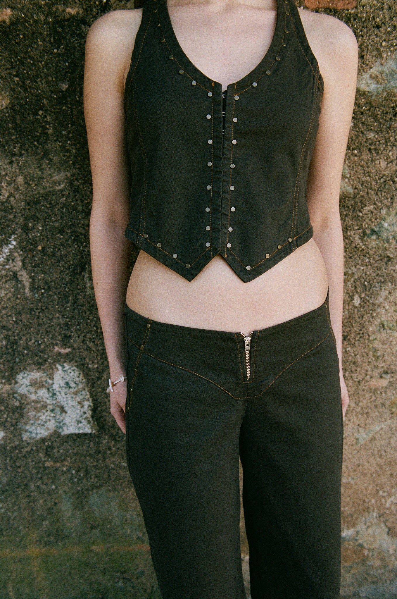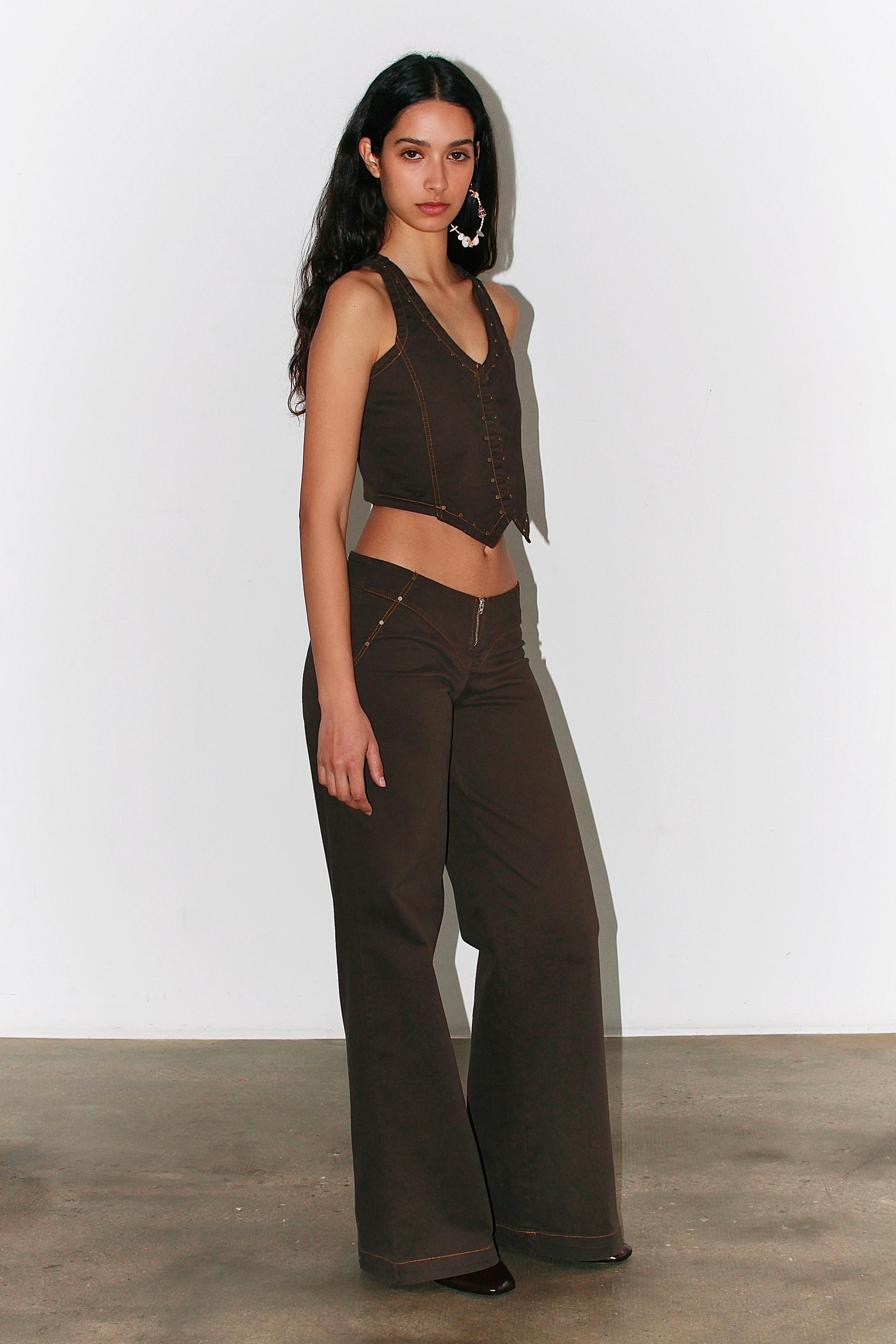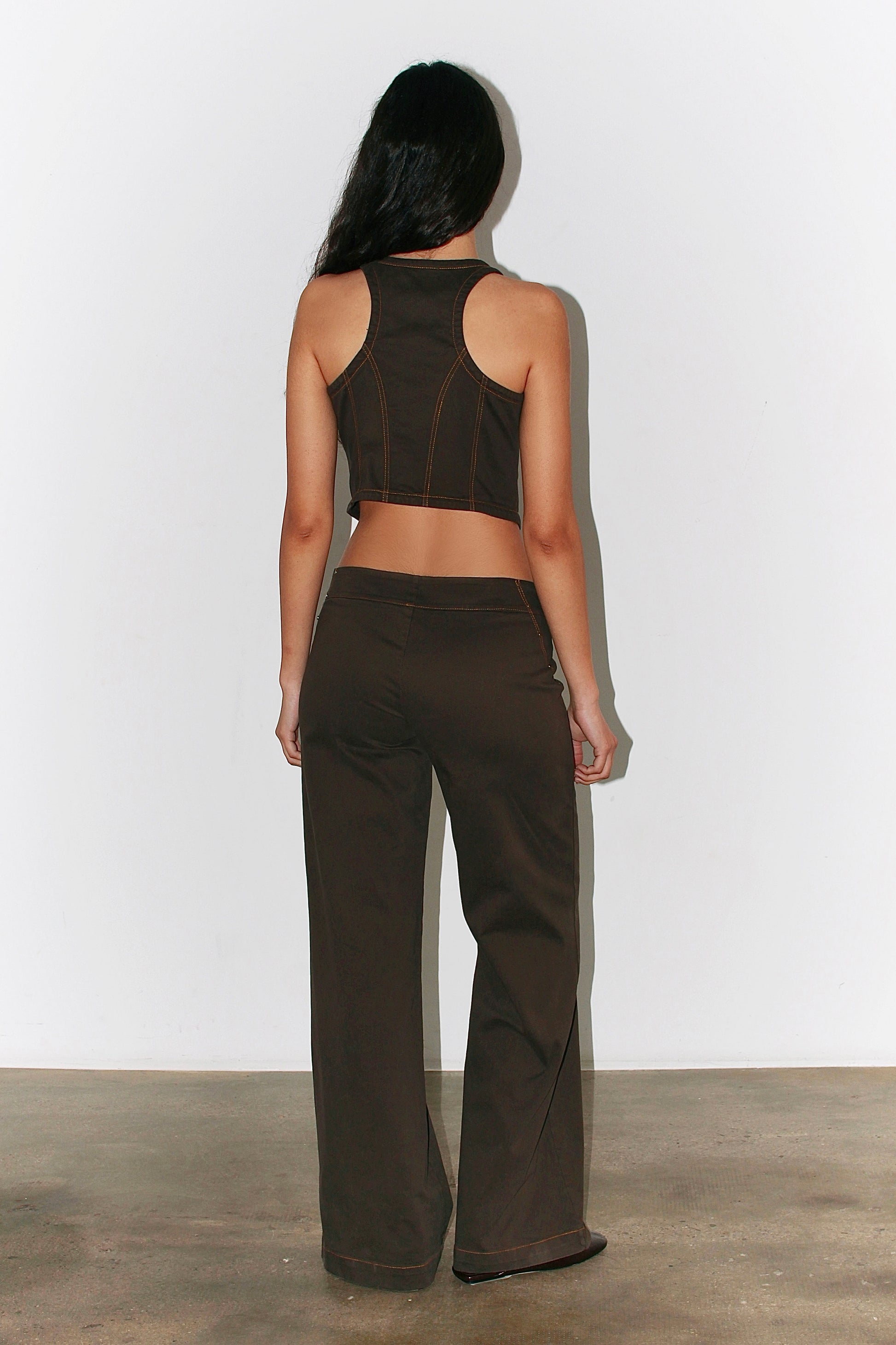 Straight-leg pants in dark brown cotton, designed with contrast stitching and a zip front detail. Low-rise fit with a curved waistband. These run small—if between sizes, we recommend sizing up. Made in Italy.
