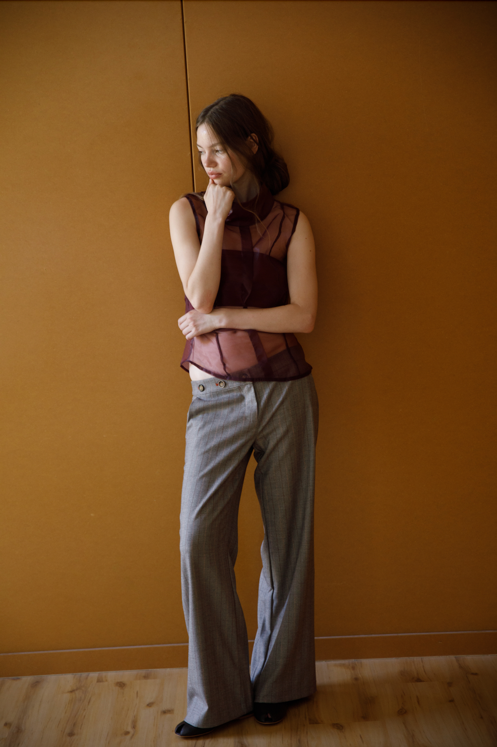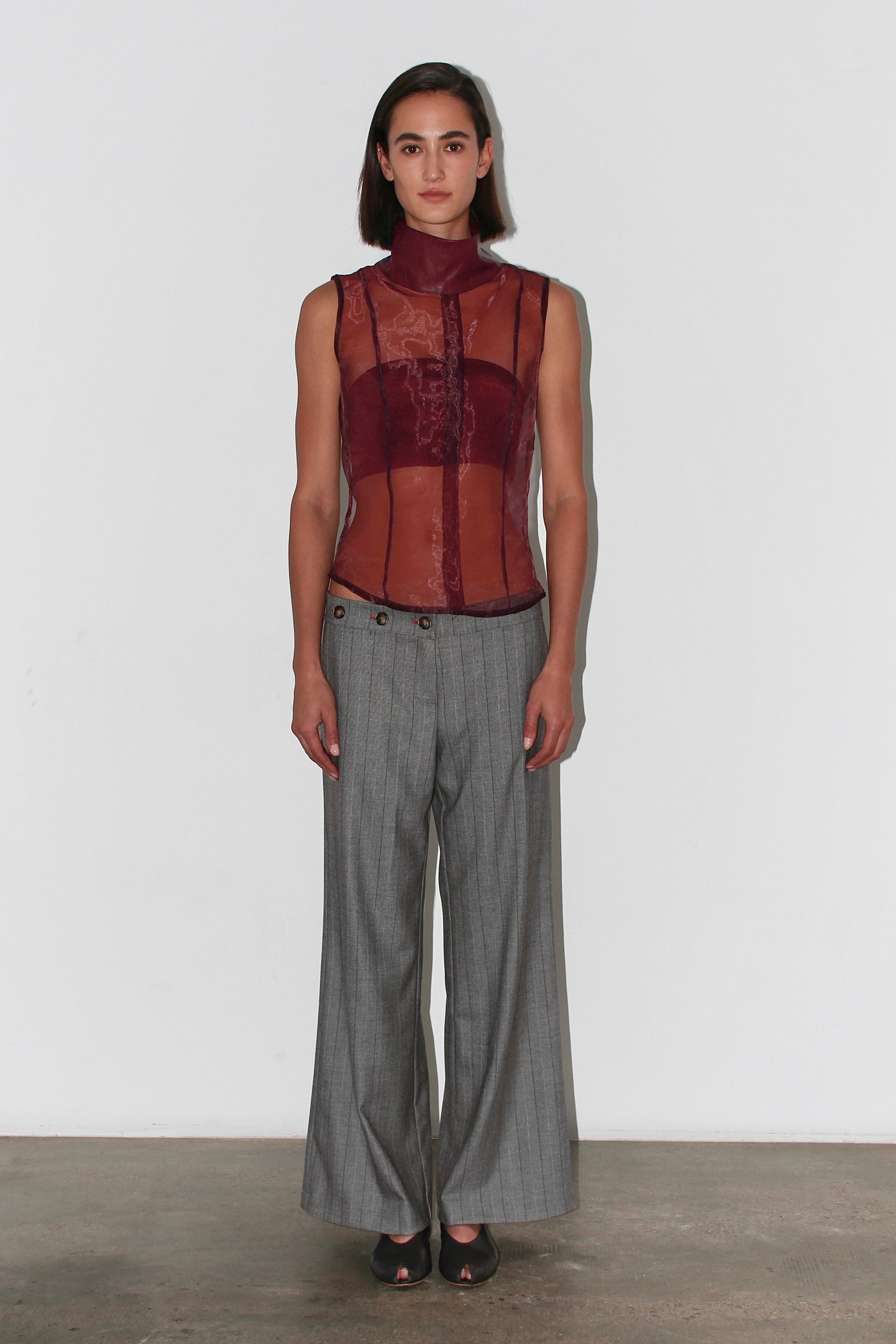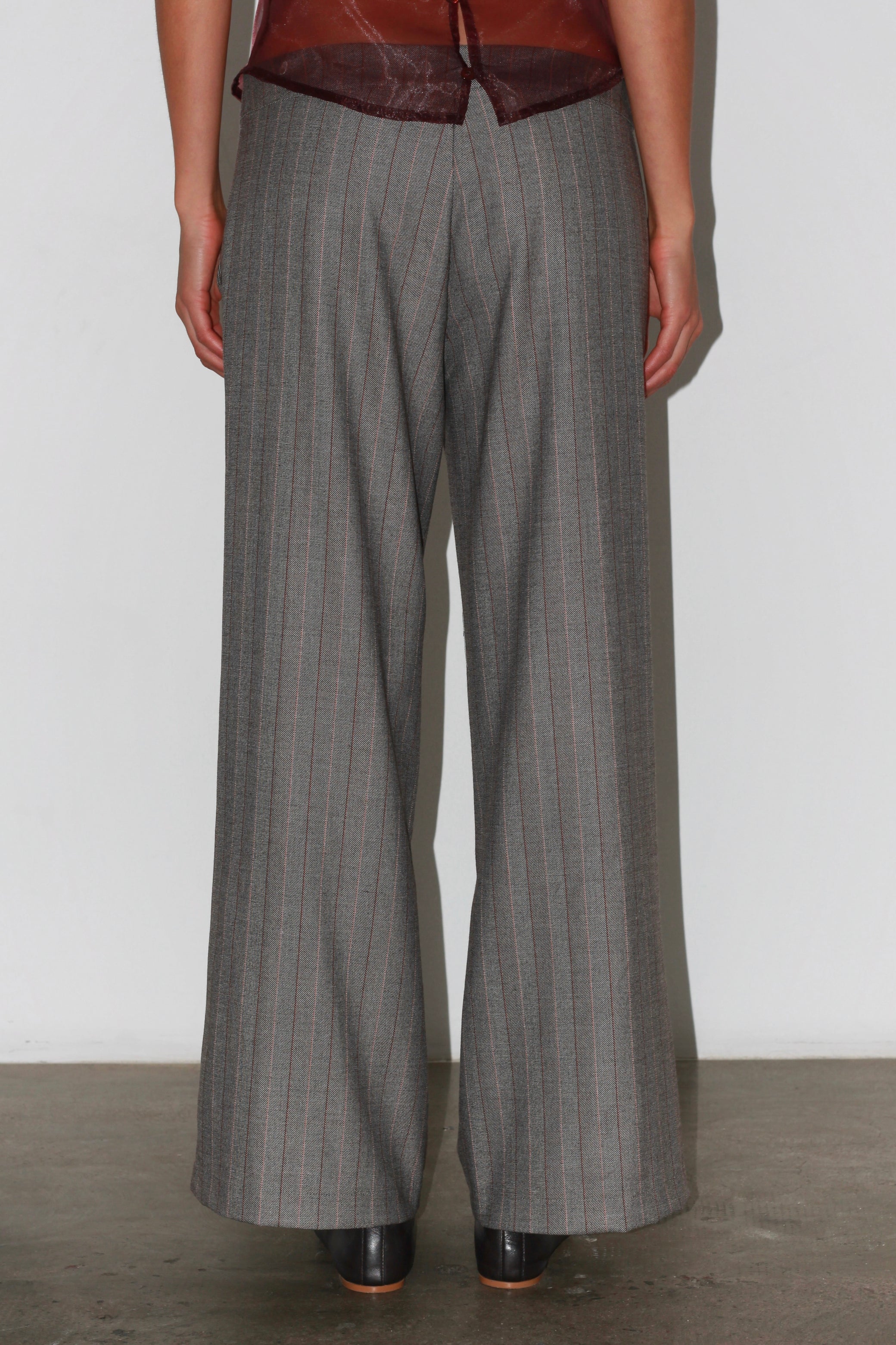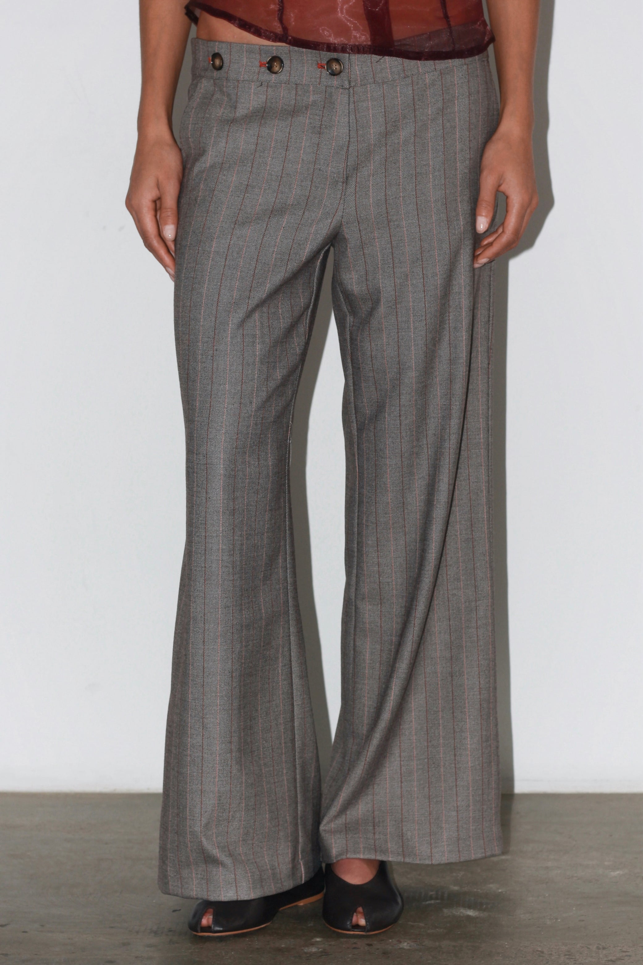 Low-rise grey pinstripe wide-leg trousers with front button detailing and a tailored finish. Made in Italy.