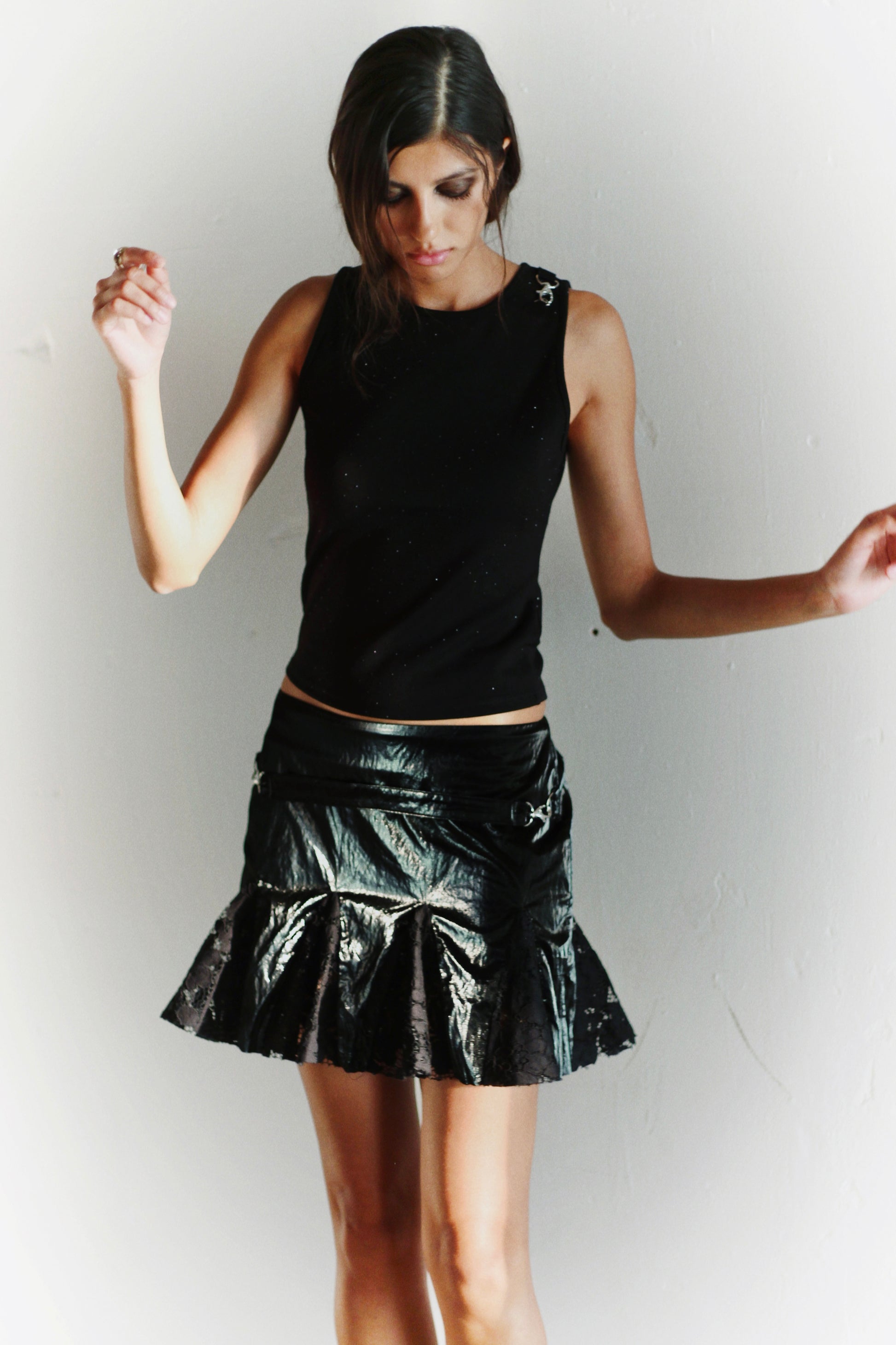 Sleeveless black top featuring small rhinestone studs and a side buckle. Made in Italy.
