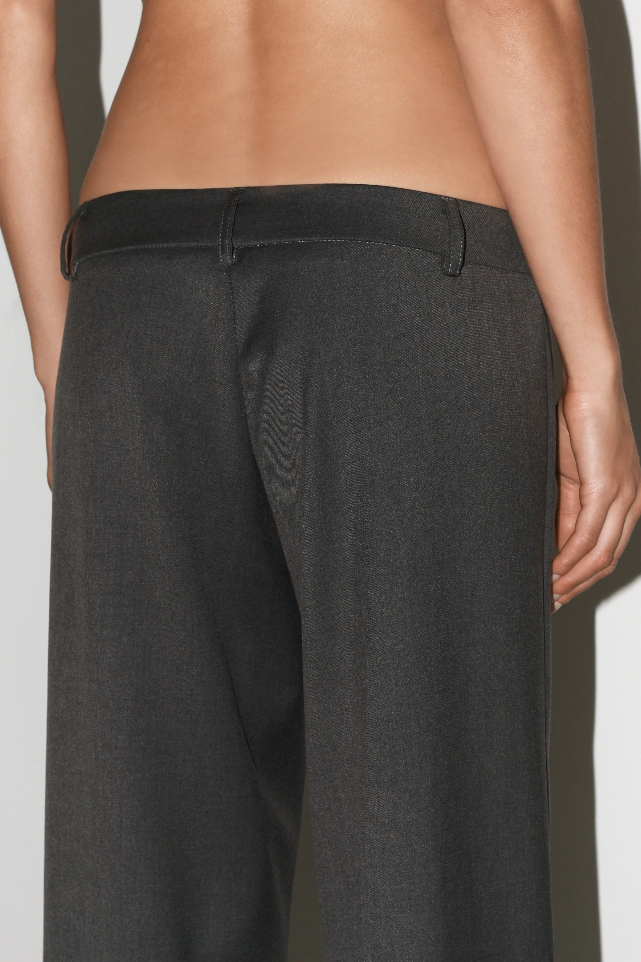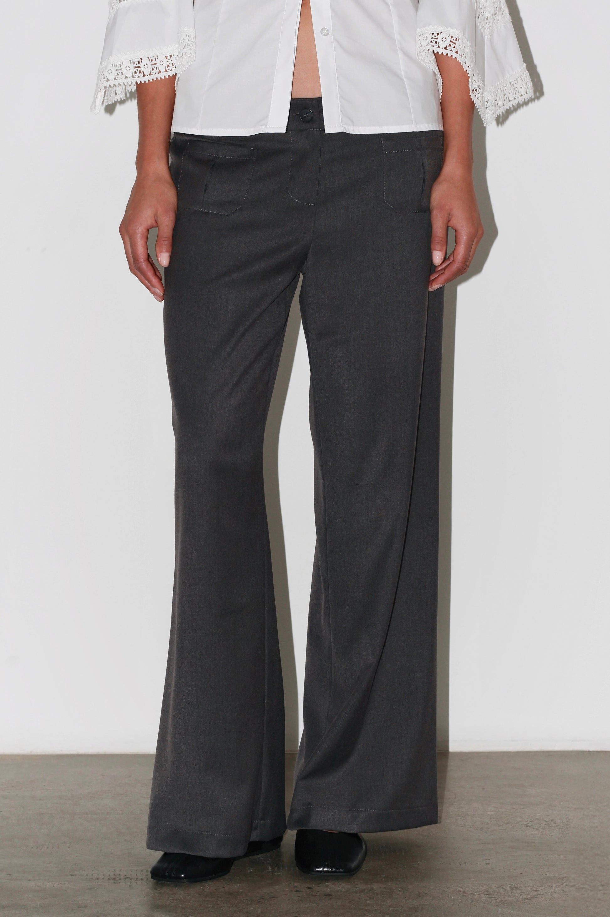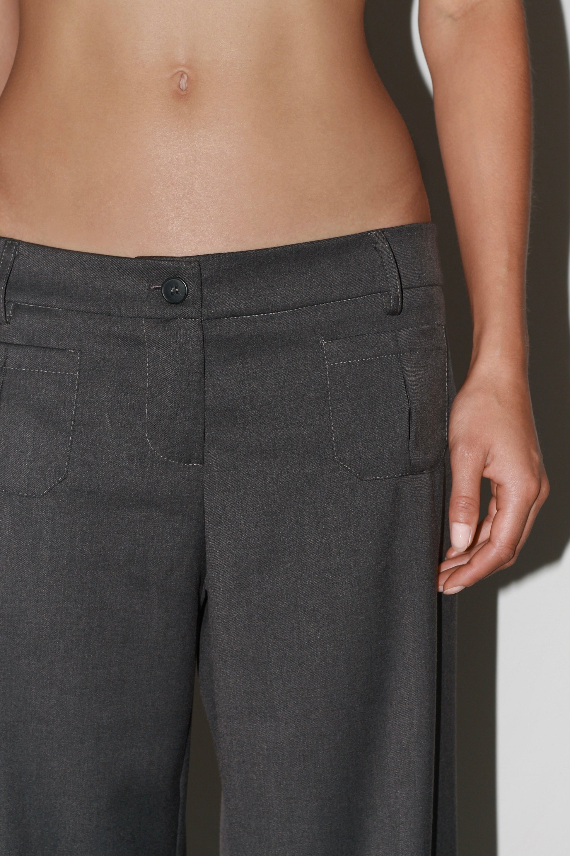 Low-rise grey wide-leg trousers with front patch pockets and a tailored finish. Made in Italy.