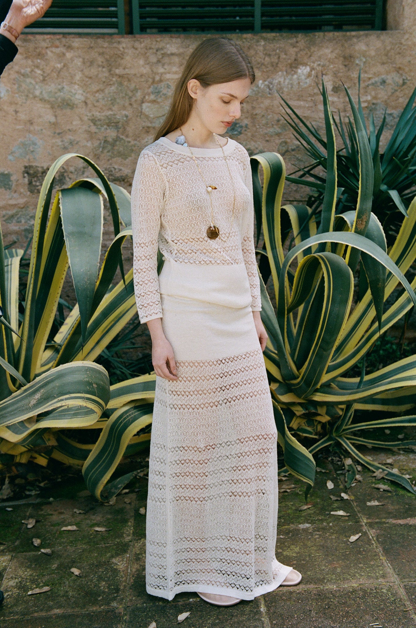Off-white sheer knit maxi skirt with a delicate pattern. Features a high slit and semi-transparent design. It comes with an extra mini white short to wear underneath if desired. Part of our Premium Collection. Made in Italy.